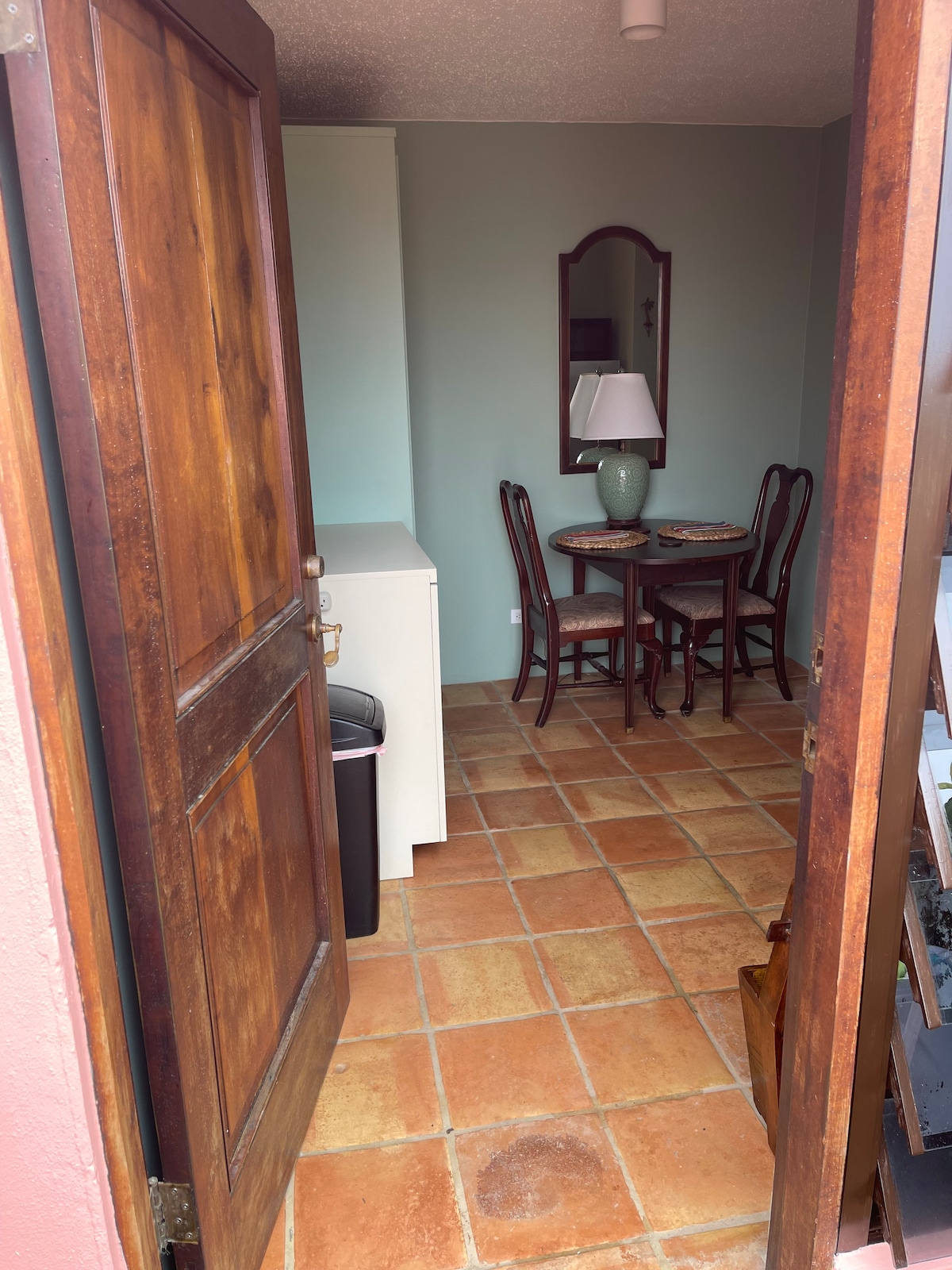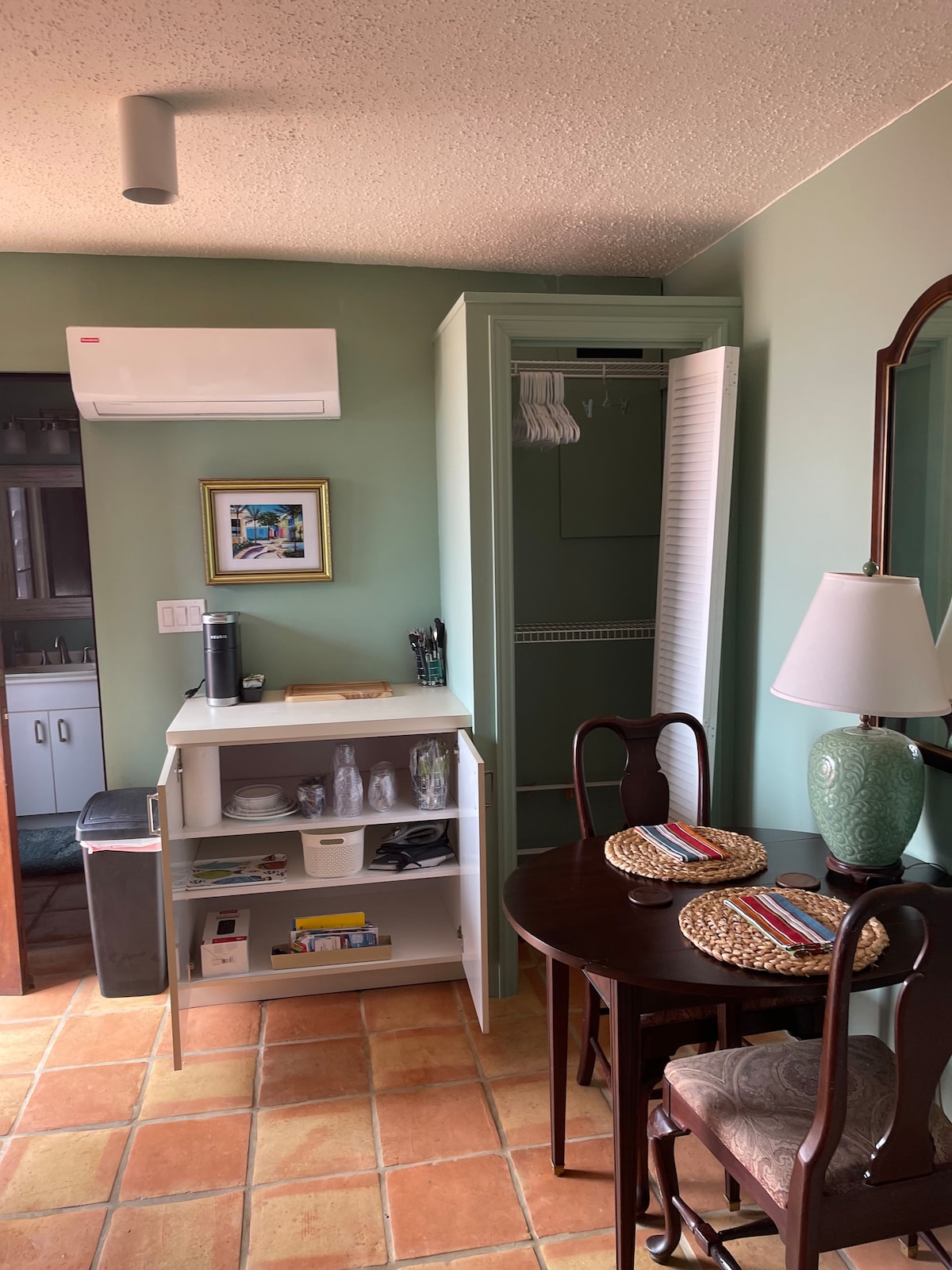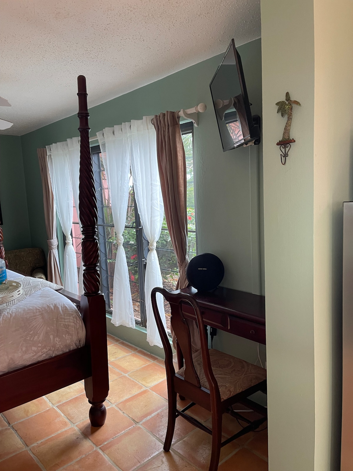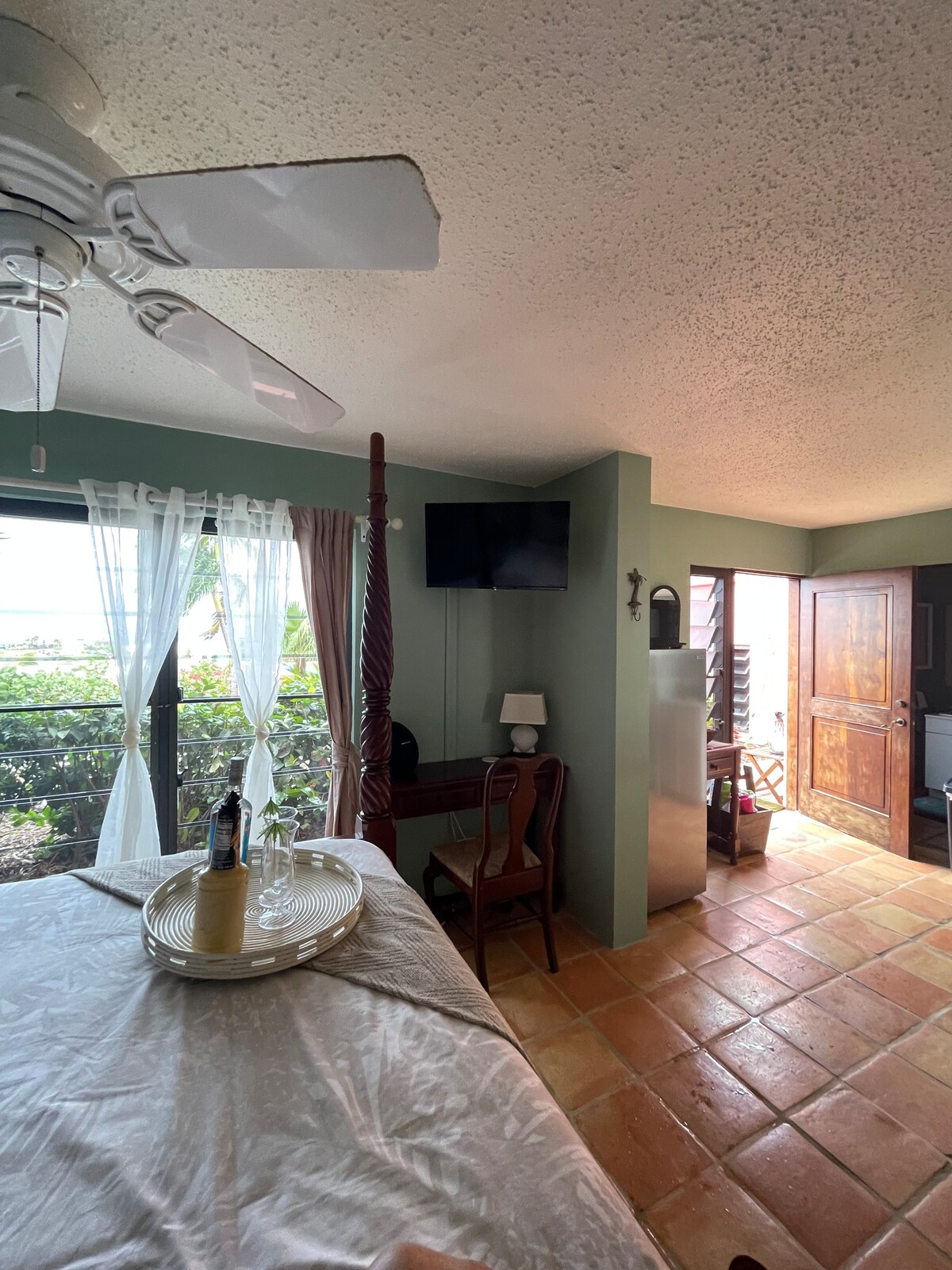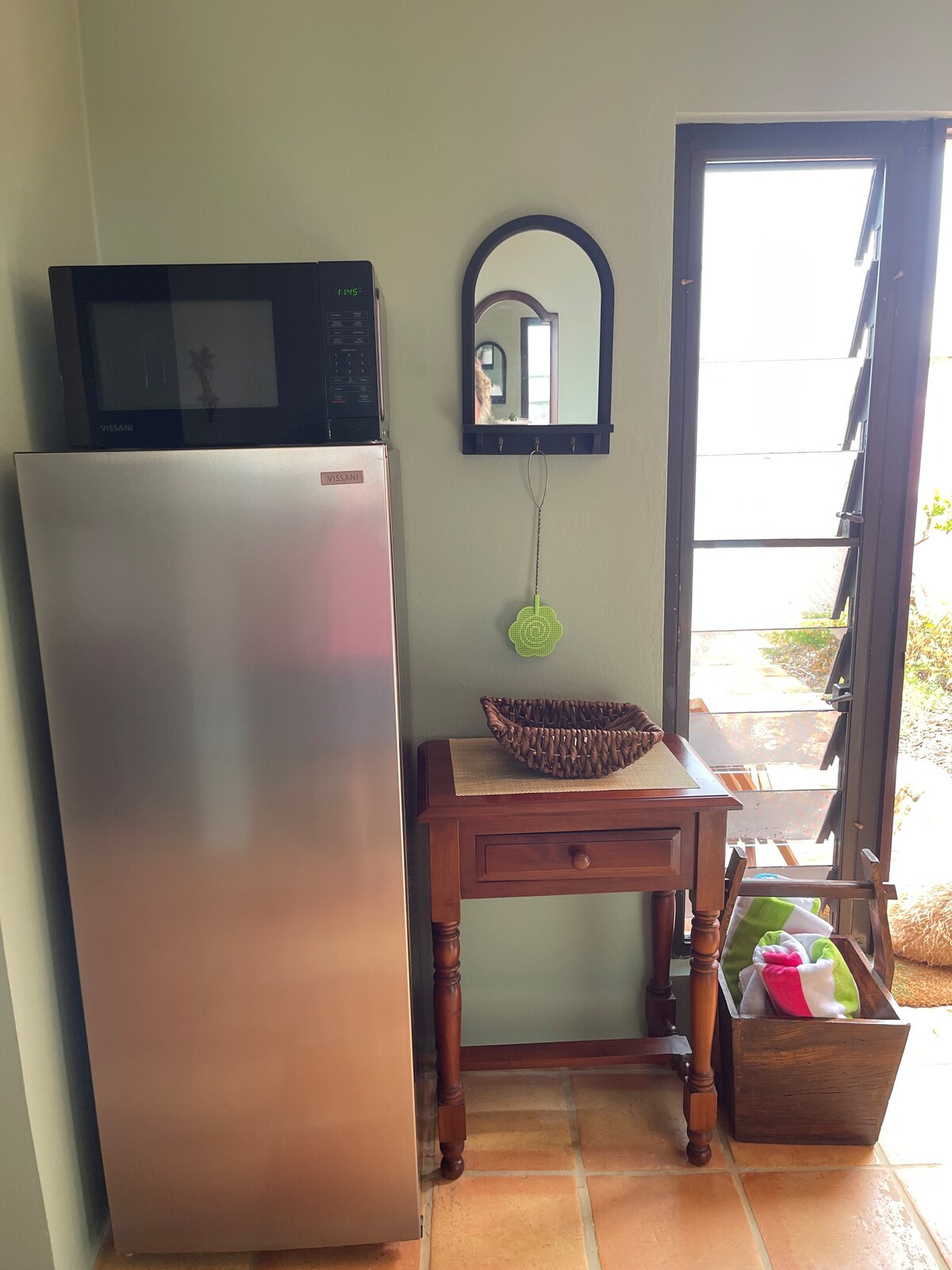 Each suite has a 7cu ft convertible Fridge so much bigger than a mini fridge (there is no freezer), microwave, Keurig Coffee maker with a few coffee pods to get you started. There is a toaster, as well as silverware, plates, cups, glasses, stemless wine glasses, can opener, bottle opener, wine opener, ice bucket and cutting board in your suite. If there is anything else you need, please just let us know & we most likely will be able to accommodate you! There is a beautiful outdoor dining table & chairs in the poolside gazebo. Typical hotel amenities are found in each suite. Bath towels, beach towels, basic toiletries, blow dryer, soap, iron/ironing board, clothes drying rack. You will find a beautiful Tommy Bahama Duvet & luxury cotton linens from NY on your beds. The rooms are beautifully decorated and each has a small desk if you need to check in on your work email while on vacation!