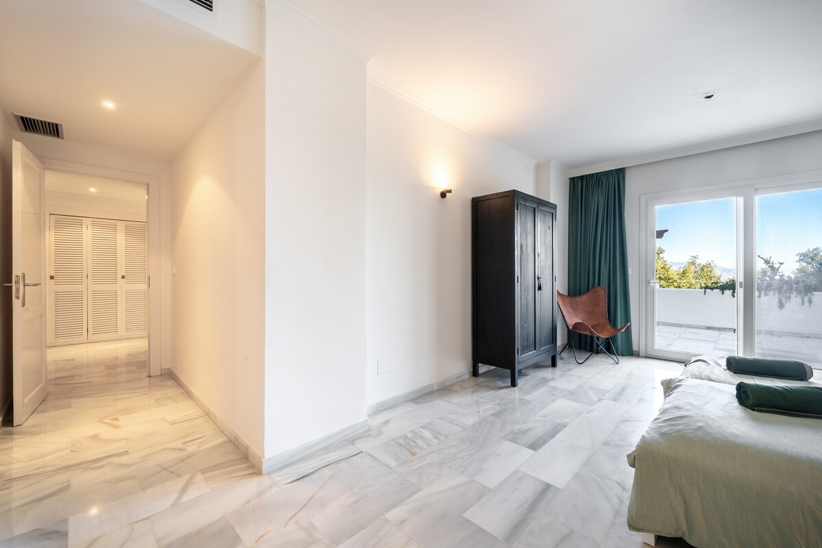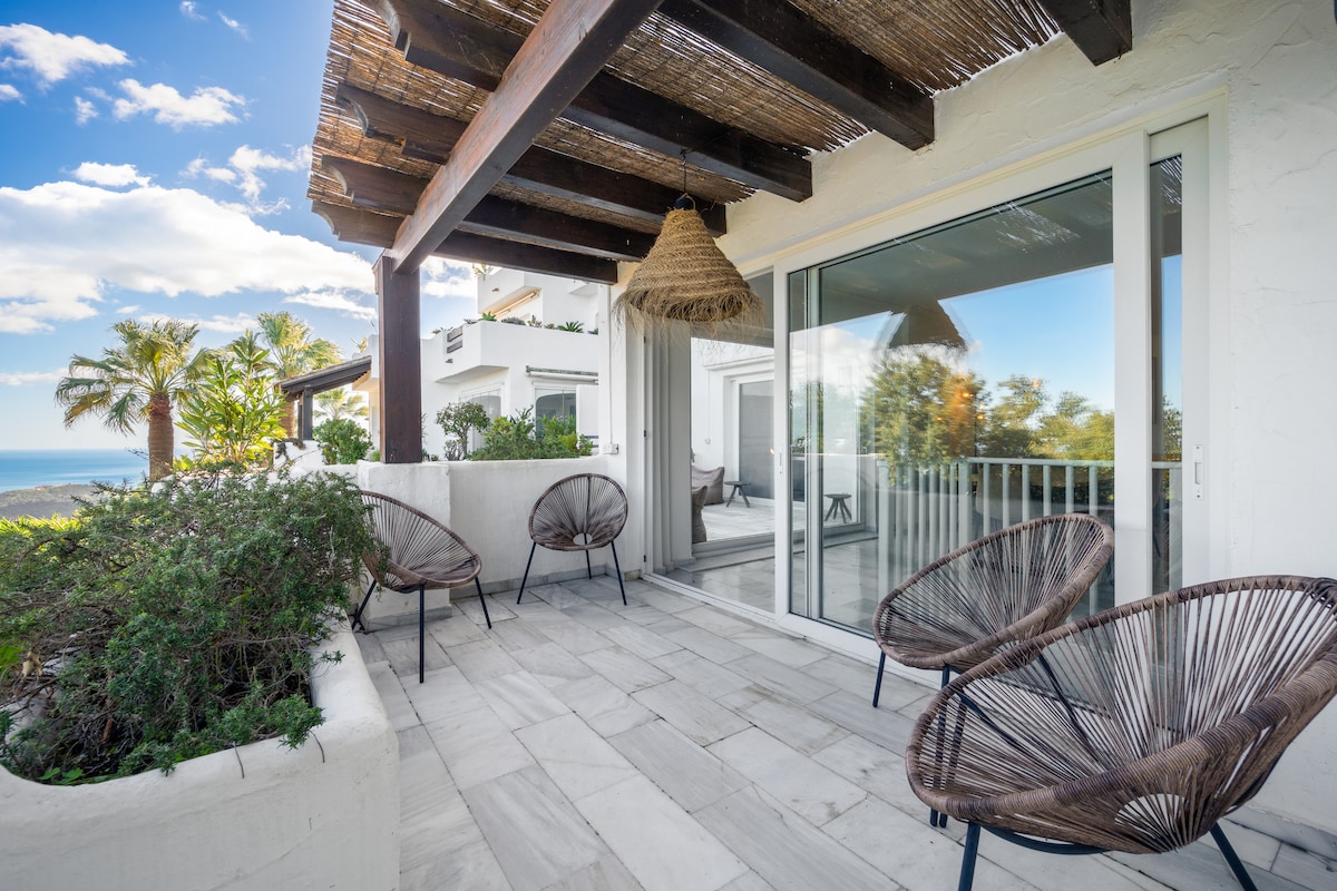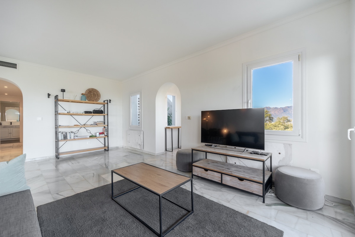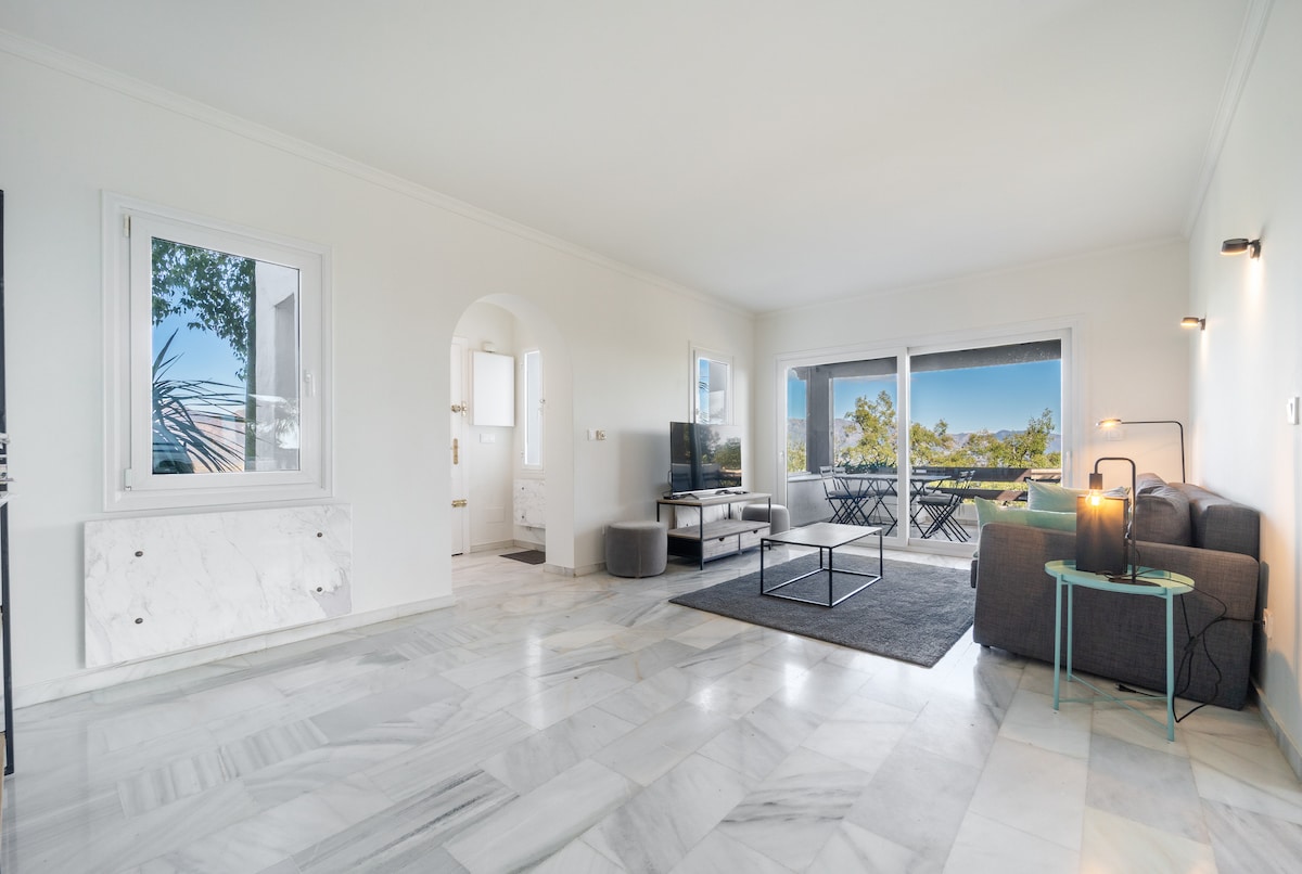 Discover a stunning, fully renovated 3-bed, 3-bath apartment in the hills above Marbella.