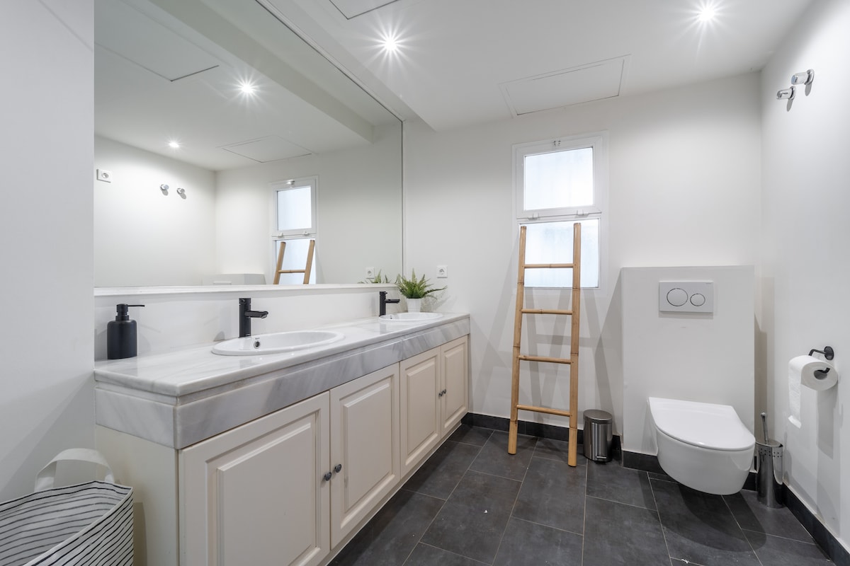 The three bathrooms are designed with style and convenience in mind. Enjoy the comfort of a relaxing bathtub and showers equipped with hot water. Essentials such as towels, shampoo, shower gel, and cleaning products are provided for convenience.
