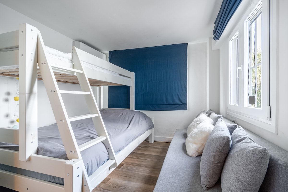 1 sofa bed, 1 bunk bed
