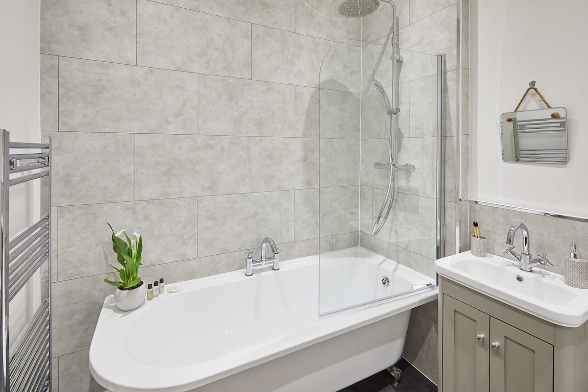 The family bathroom is a delightful space where you can enjoy a relaxing bath in bathtub that also boasts an overhead shower. It has a wash basin and a WC, as well as a towel rail.