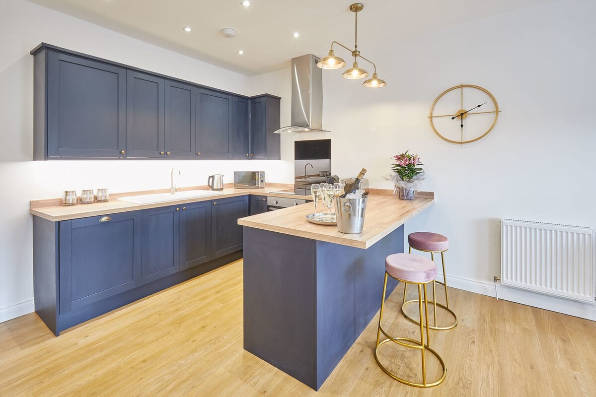 The open-plan living, kitchen and dining area at Licence to Chill is a real social hub where you can enjoy quality time with your loved ones. The space is light thanks to the large windows whilst it also features a comfy sofa, armchairs, and a large flat screen TV to keep you entertained in the evening.Also sharing this space is a fully-equipped kitchen with modern appliances and cookware, so you can cook up your favourite meals during your coastal getaway. The dining table is spacious and has seating for all.