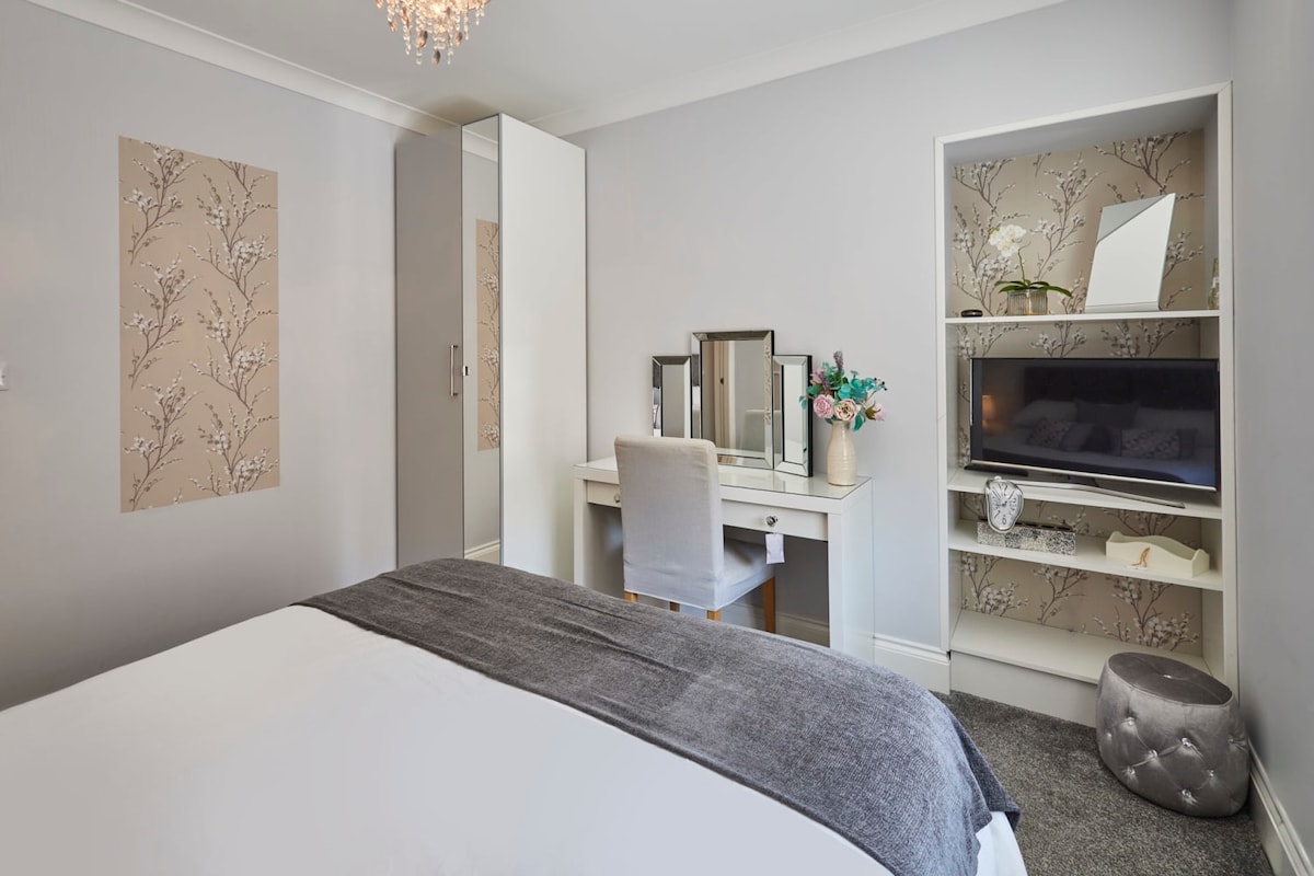 Head back out to the hallway and you’ll find the two bedrooms and bathroom. With an all-round cosy feel, both bedrooms are spacious and stylish. There are lamps, bedside tables and light neutral coloured walls. You’ll enjoy your nights sleep at Brooklands Timeless as both the king size bed in the first bedroom and double bed in the second bedroom boast the finest quality bedding and linens. Ideal for lazy mornings, you can make yourself a cuppa and watch the selection of Freeview channels on the wall mounted TV.