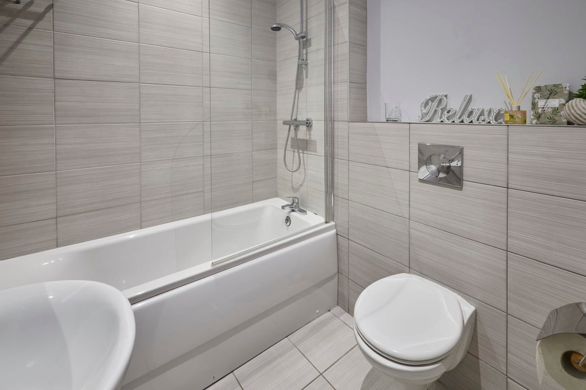 With lightly striped tiles and silver fittings, the family bathroom is an ultra clean and modern space. It boasts a bathtub with an overhead shower, along with a WC and basin.