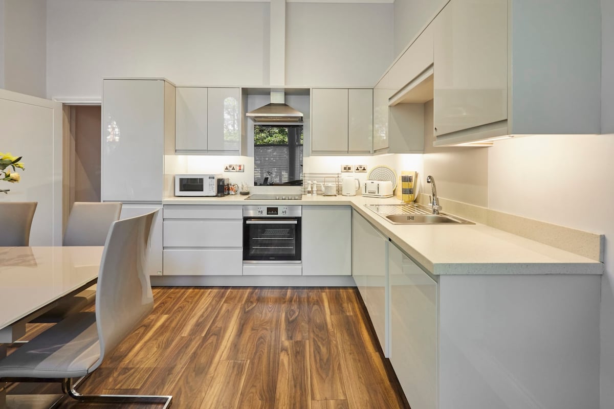 With white, high shine cabinets, smooth worktops and a white splashback, this space is seriously stylish. Fully equipped for all stays, the kitchen boasts a fridge-freezer, kettle, microwave, oven, hob, and toaster. It also includes the added luxuries of a dishwasher and washing machine.