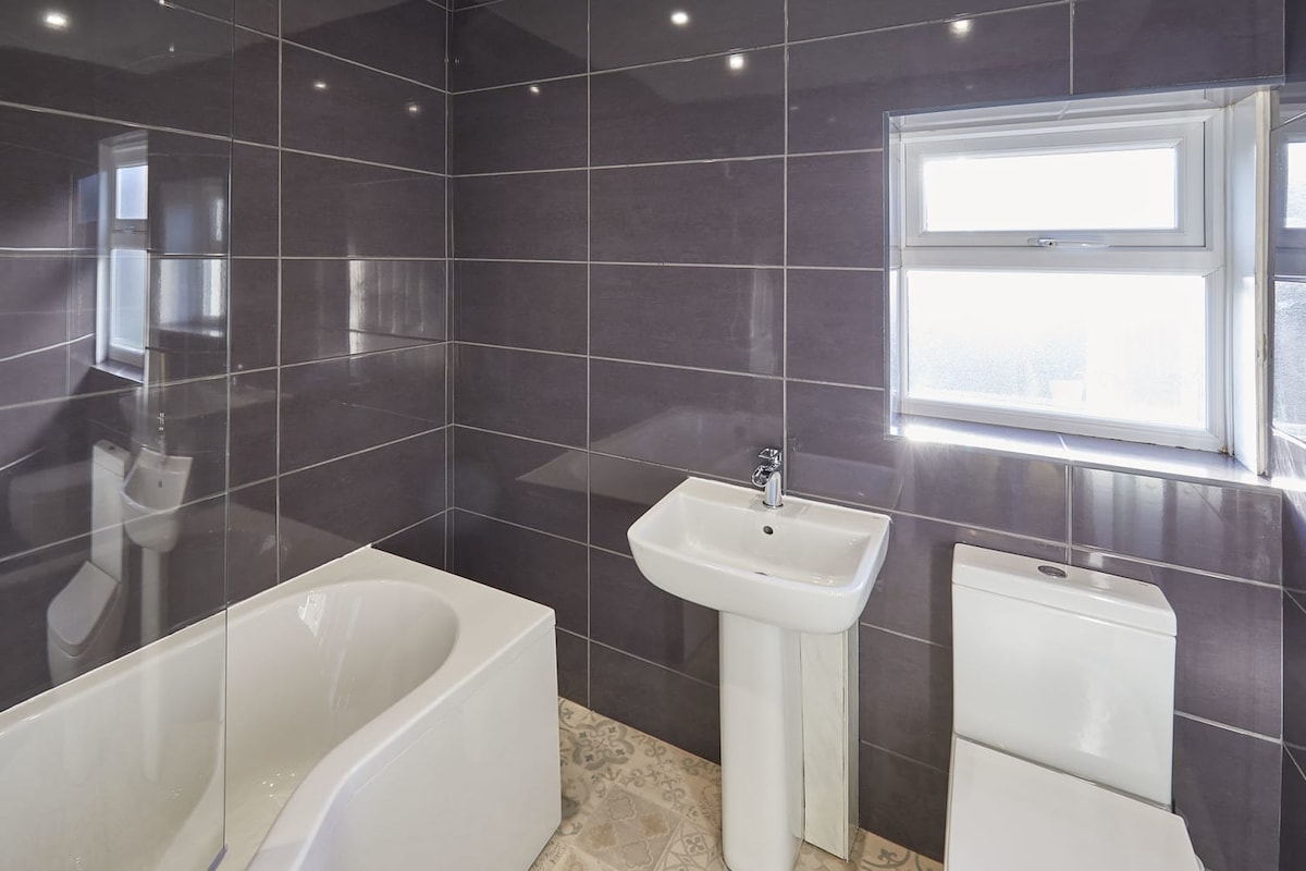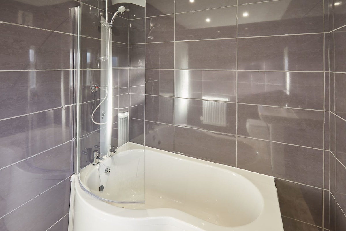 The family bathroom boasts a bathtub with overhead shower, as well as a WC and wash basin.
