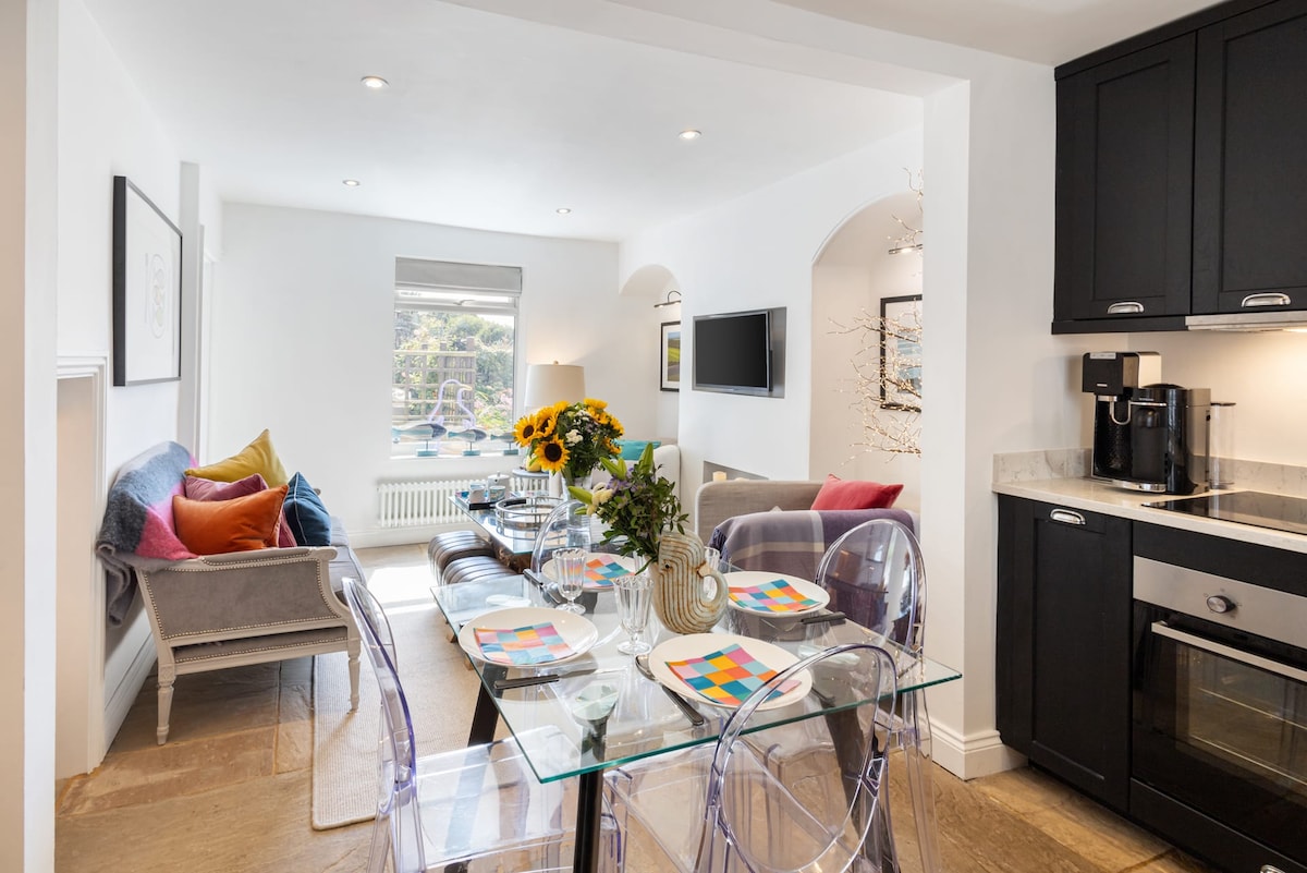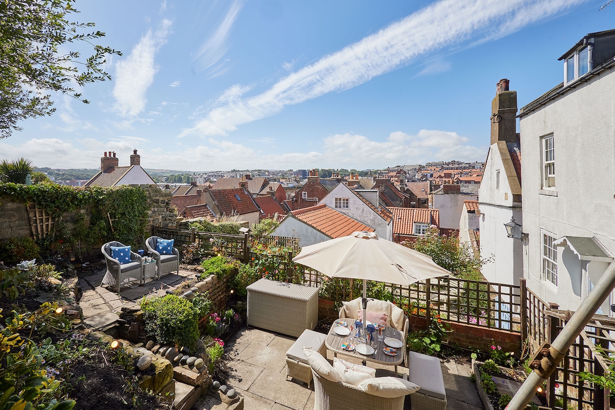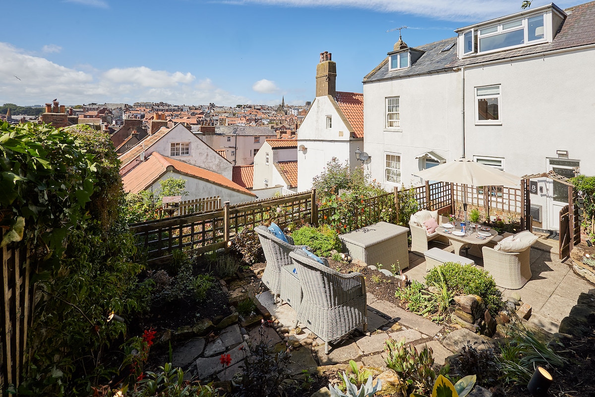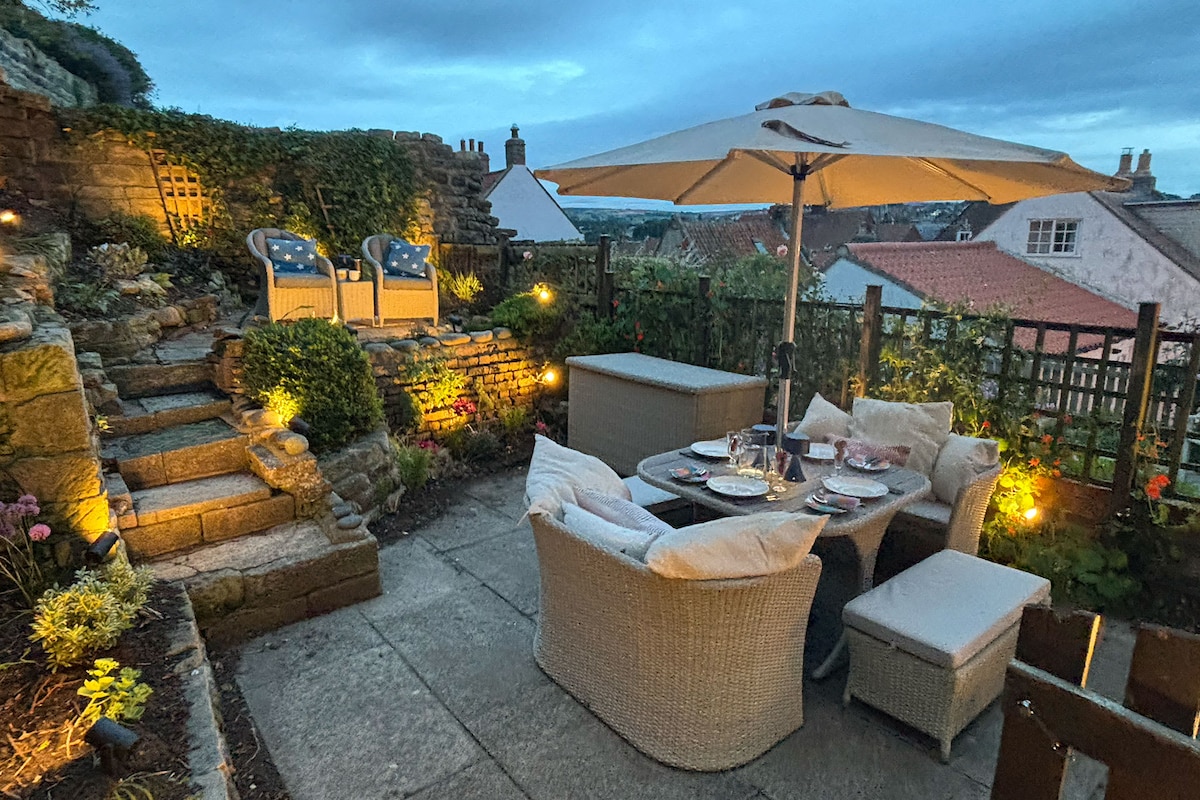 Voyagers’ View has a fabulous, enclosed garden, unusually large for the old town, with beautiful views across the rooftops to the town centre. You’ll find a dining table and chairs, along with an additional separate seating area. This space is perfect for outdoor dining, a morning cuppa, playing garden games, or just relaxing in the sun. At night, the garden can be lit up to create a truly magical experience.