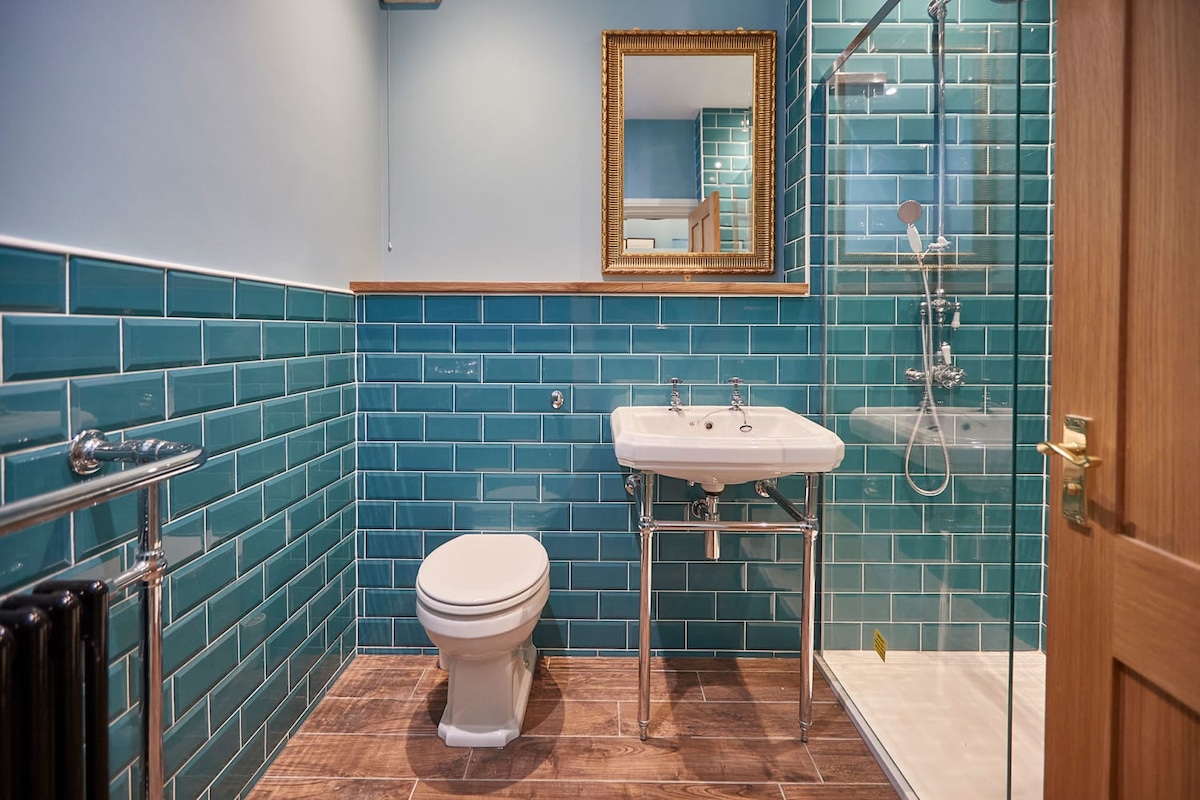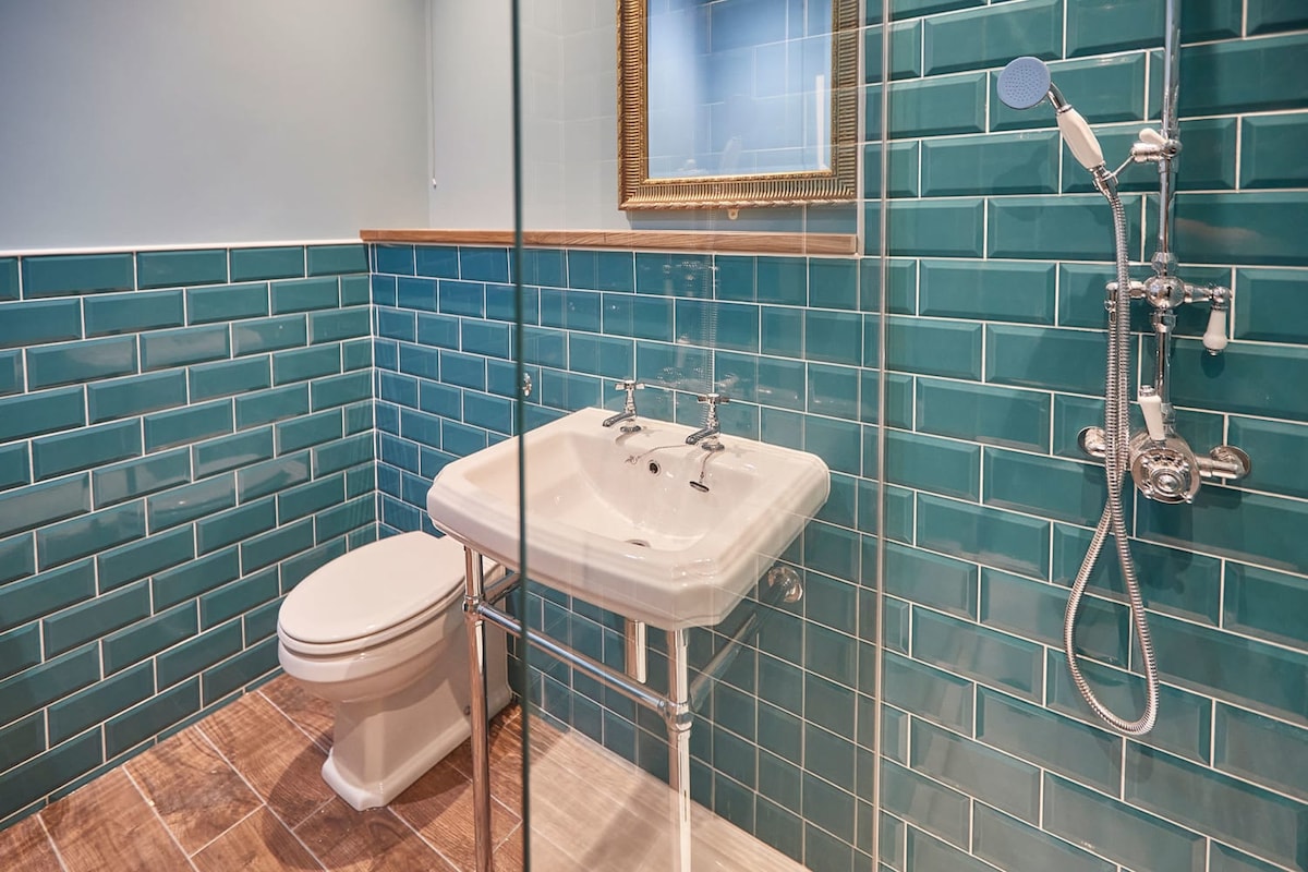 The family bathroom features a large shower, wash basin and WC.