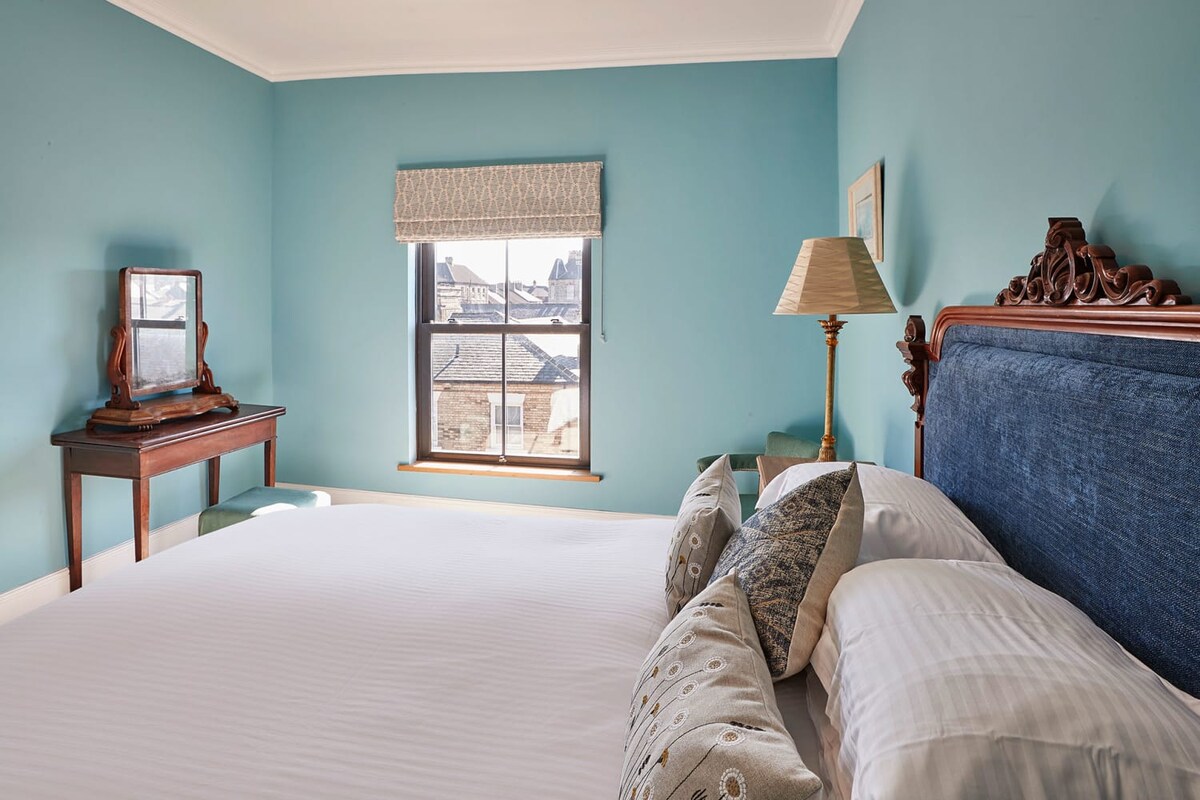 The living room at Turnstone features a large bay window which allows light to flood the space. Take a seat on the two window seats and watch the world go by or kick back and relax on the stylish green sofa. When the night draws in, switch on the fire and the flat-screen TV to feel instantly cosy.Also sharing this space is the comfy king-size bed. It is a snug haven with luxurious bedding and plush cushions. Lamps and bedside tables add nice touches.