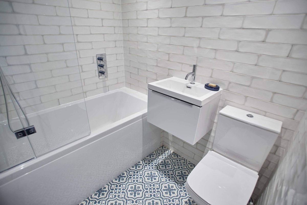 The family bathroom is just outside the twin bedroom. A newly decorated space with bright white wall tiles and Victorian style patterned floor tiles. The bathroom features a shower bath, a WC and a basin. This simple, calm space is perfect to enjoy a soak in the bath after a day exploring.
