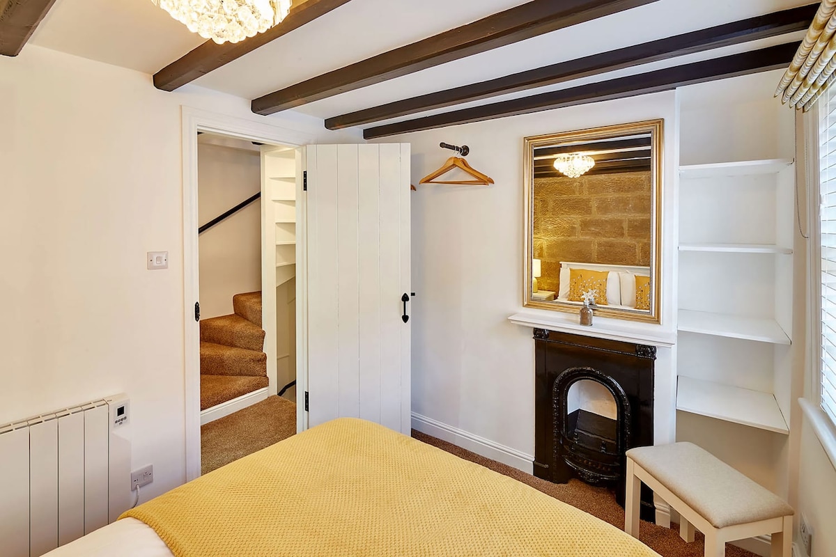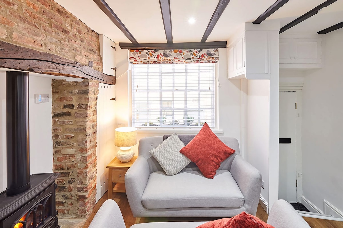 Pre-dating the 17th century, this mid-terrace holiday home is grade II listed and likely to have been a former doctor’s residence. Quirky and characterful, the property is set over three floors and sleeps up to four guests.Upon entering Thimble Cottage, you’ll be welcomed into the open plan living, dining and kitchen area. Featuring low beamed ceilings, a large Georgian window and a rustic brick statement fireplace, this cosy space has a traditional cottage feel. The kitchen is fully equipped so you can make the most of your self-catering stay. Unwind with your loved ones on the grey sofas or enjoy meals together in the dining area.