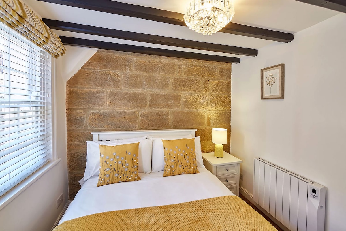 A winding staircase takes you up to the first floor where you’ll find the master bedroom and family bathroom. The double bedroom has an exposed sandstone feature wall with two double sash windows letting in plenty of light and fresh sea air. Pops of ochre are added in the soft furnishings to create a cohesive look and a truly relaxing feel.