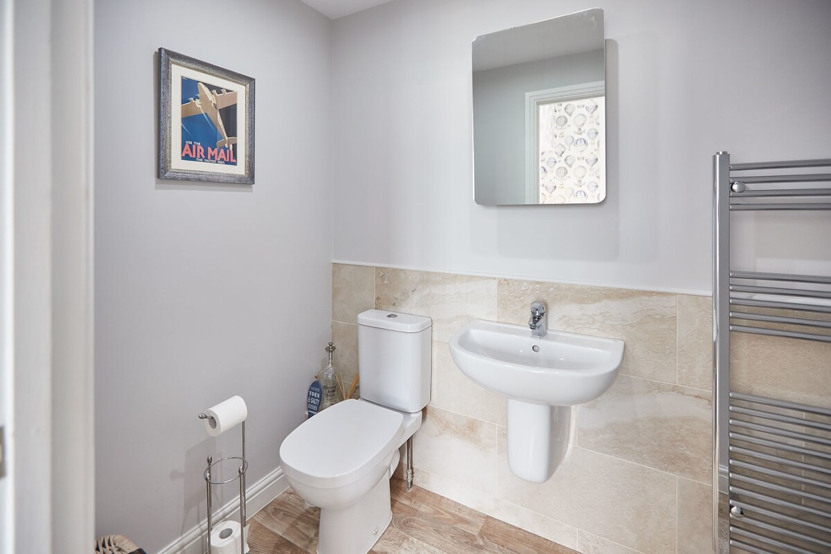 Fully equipped with modern appliances and cookware, the kitchen diner has everything you could need to make the most of your self-catering stay. Beautifully styled, the shaker kitchen is dove grey in colour and there is a large dining table with dining chairs and a built-in bench.