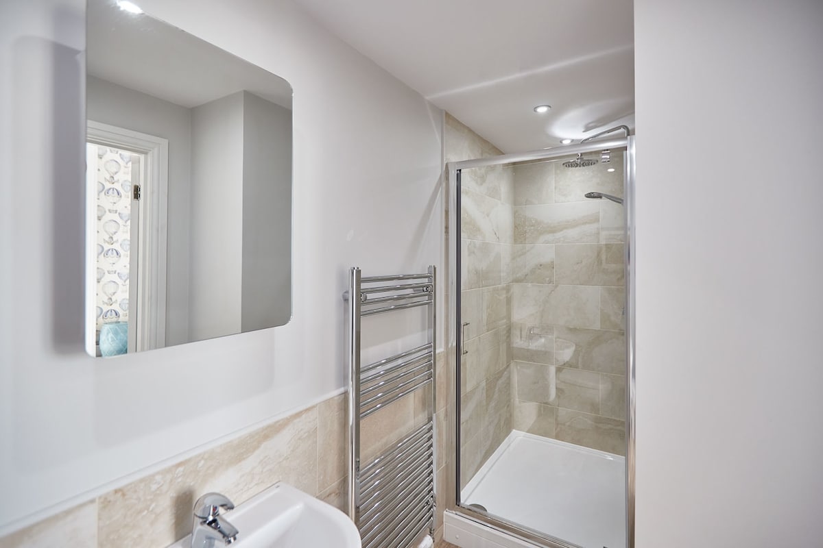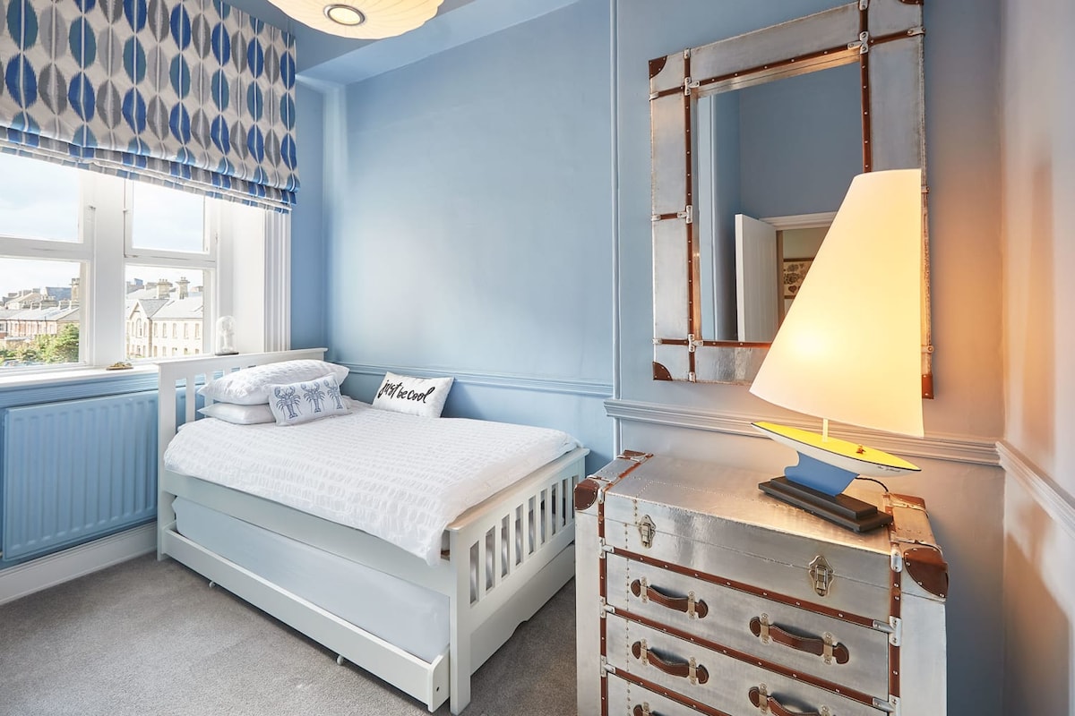 The Zetland Apartment benefits from three bedrooms. Head to the master bedroom and you’ll find a stunning space with vintage style wallpaper, a comfortable king size bed and large double doors which open out onto the balcony. The space also boasts an ensuite shower room. The second bedroom features a double bed. The third bedroom has a trundle bed which includes a single bed and an additional pull out single bed which is always made up.