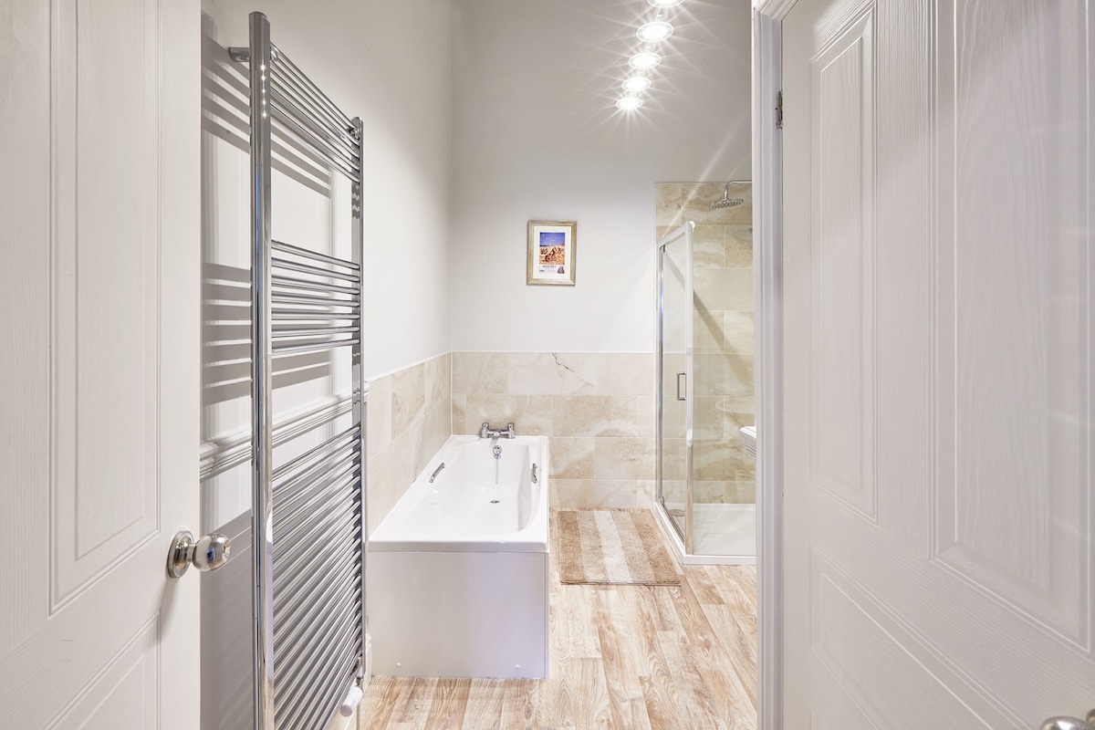 Spacious and modern, the family bathroom in the apartment includes a bathtub, large walk in shower, WC and basin.