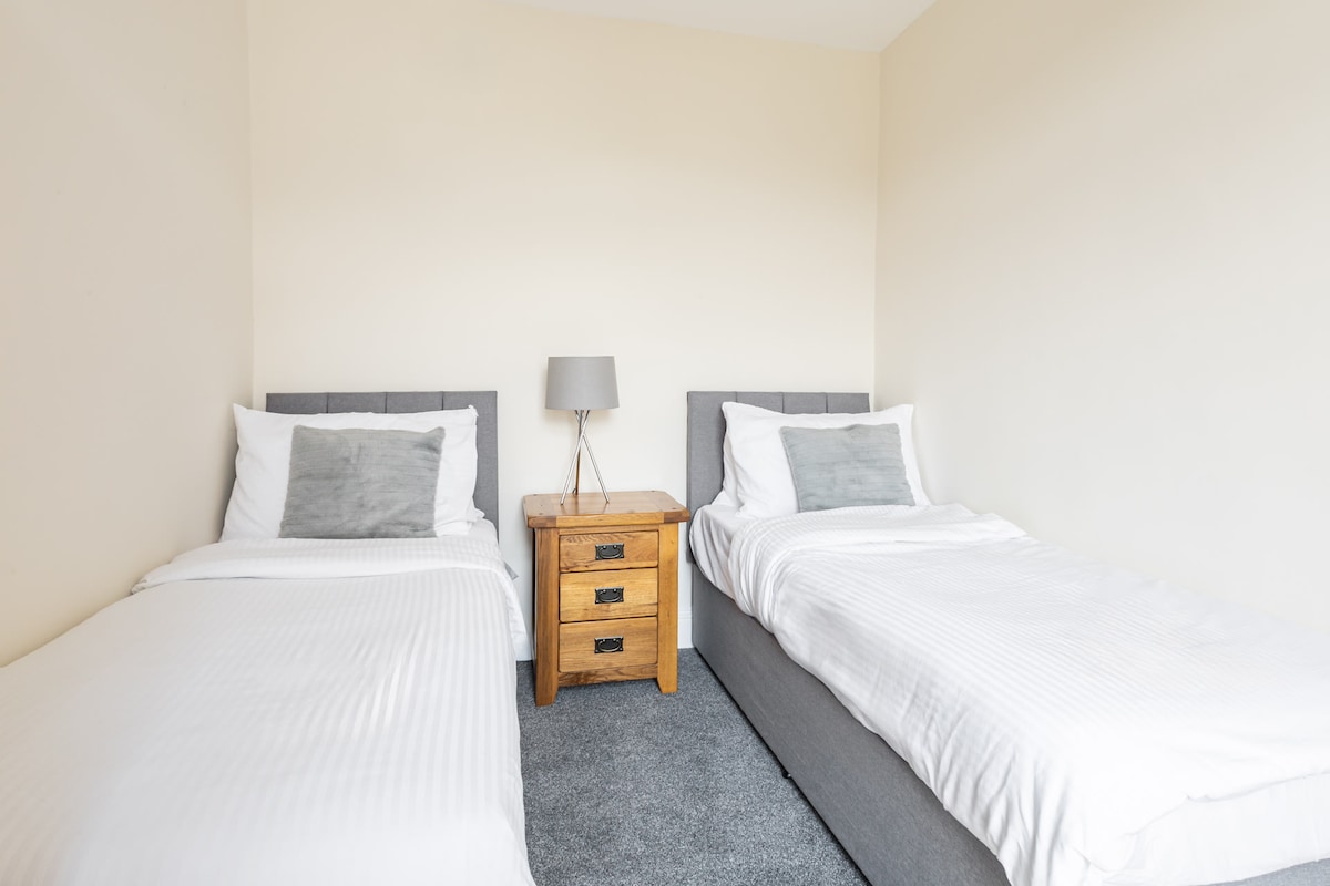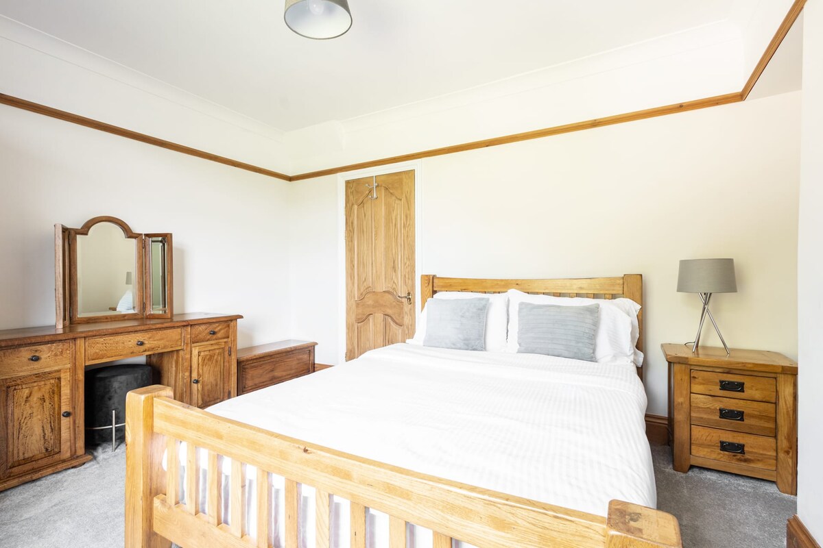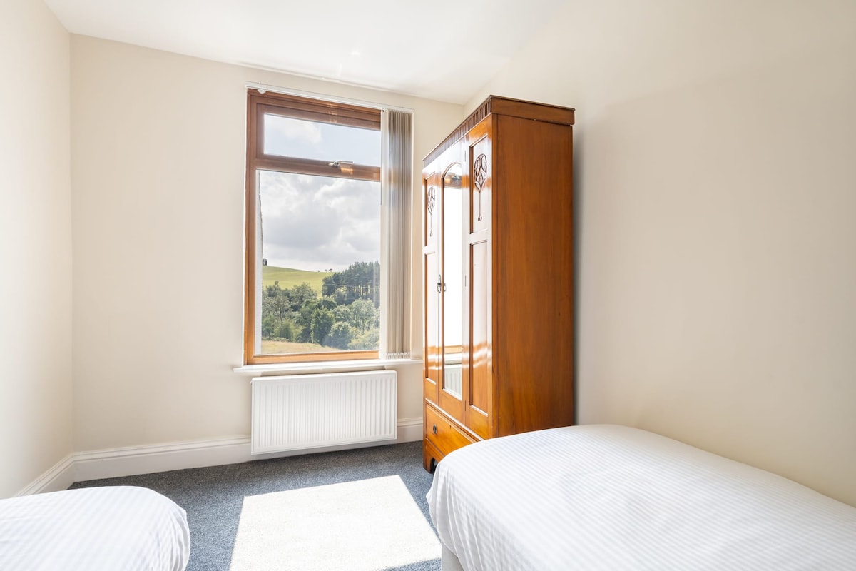 The master bedroom features a king-size bed with neutral traditional wooden furnishings, including a chest of drawers and a dressing table for your belongings. The second bedroom offers twin single beds, ideal for children and solo members of your party. Both bedrooms are bright and airy with large windows and white interiors and offer sliding blinds for a peaceful rest any time of day.
