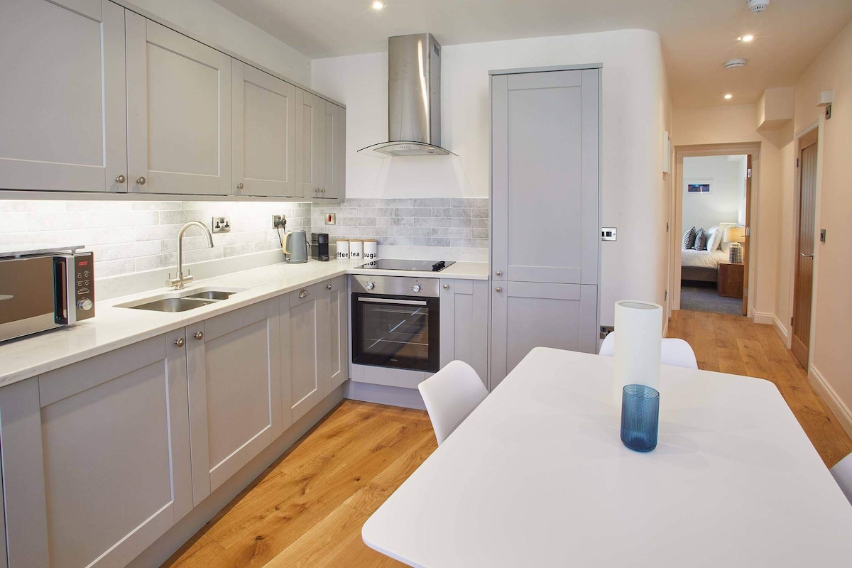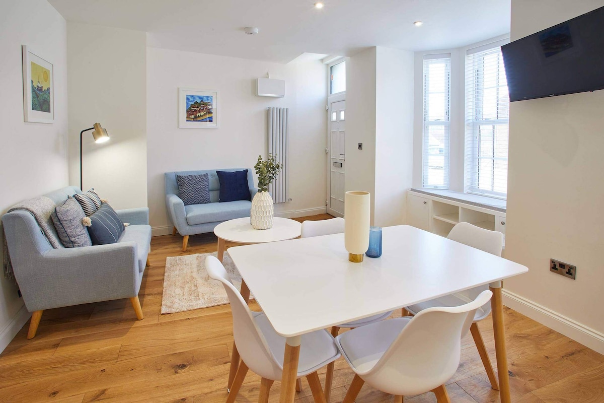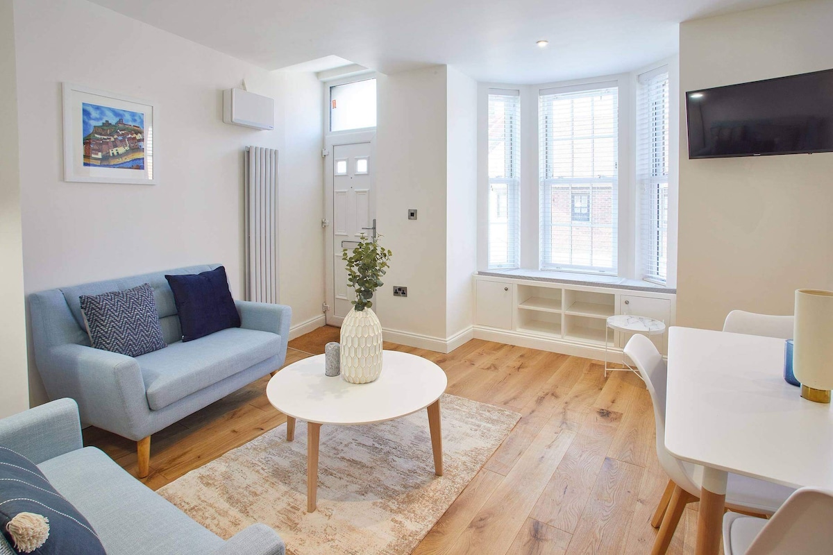 This bright ground floor apartment has been renovated to an extremely high standard creating a perfect space to enjoy a short stay by the coast. With a pale, neutral colour palette the apartment gives a real sense of calm.On entering the apartment you step directly into the open plan living, dining and kitchen area. The two cool blue sofas frame the living area, surrounding a white wooden coffee table and metallic thread rug. From the feature window seat you can see the infamous Whitby Abbey, watch the world go by or enjoy the latest drama on the wall mounted, flatscreen tv.