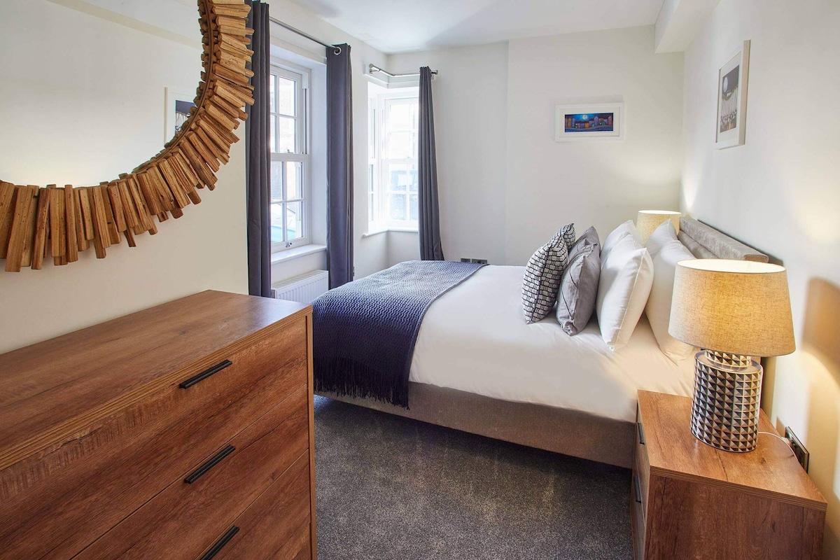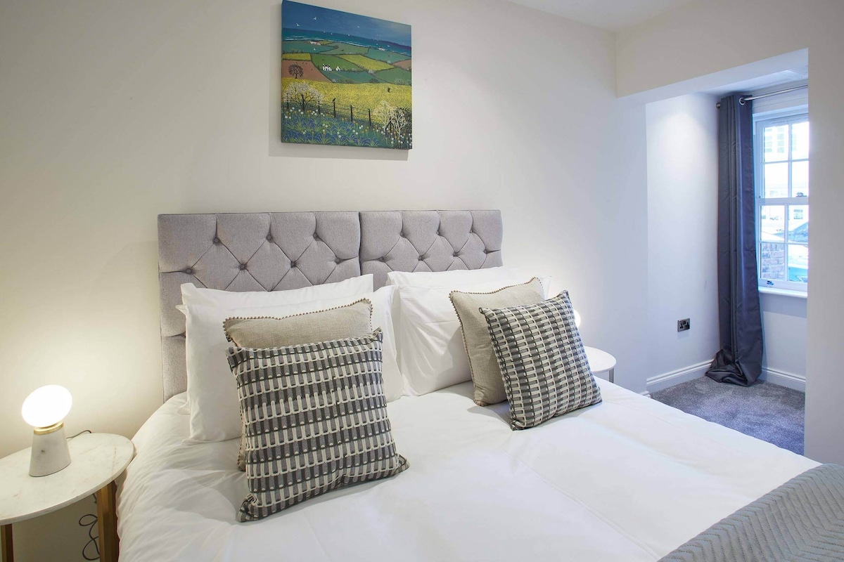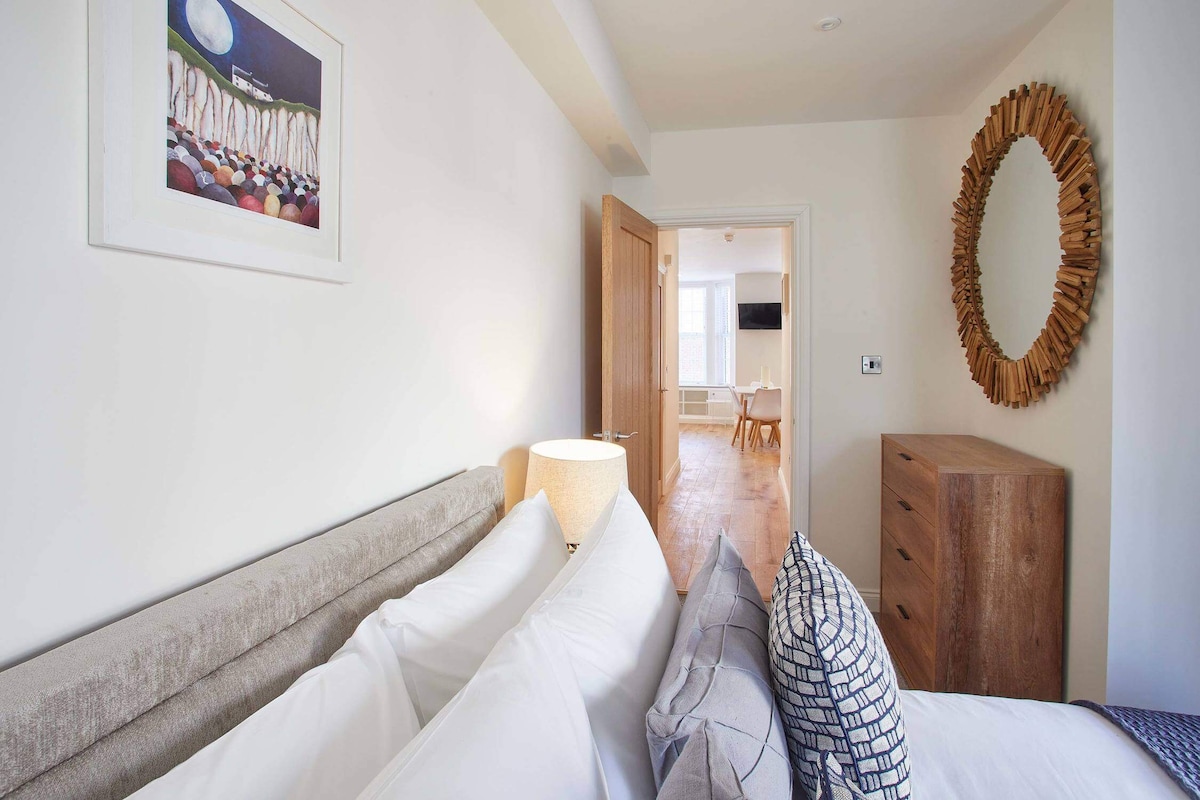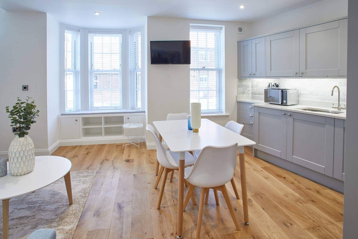 This bright ground floor apartment has been renovated to an extremely high standard creating a perfect space to enjoy a short stay by the coast. With a pale, neutral colour palette the apartment gives a real sense of calm.On entering the apartment you step directly into the open plan living, dining and kitchen area. The two cool blue sofas frame the living area, surrounding a white wooden coffee table and metallic thread rug. From the feature window seat you can see the infamous Whitby Abbey, watch the world go by or enjoy the latest drama on the wall mounted, flatscreen tv.
