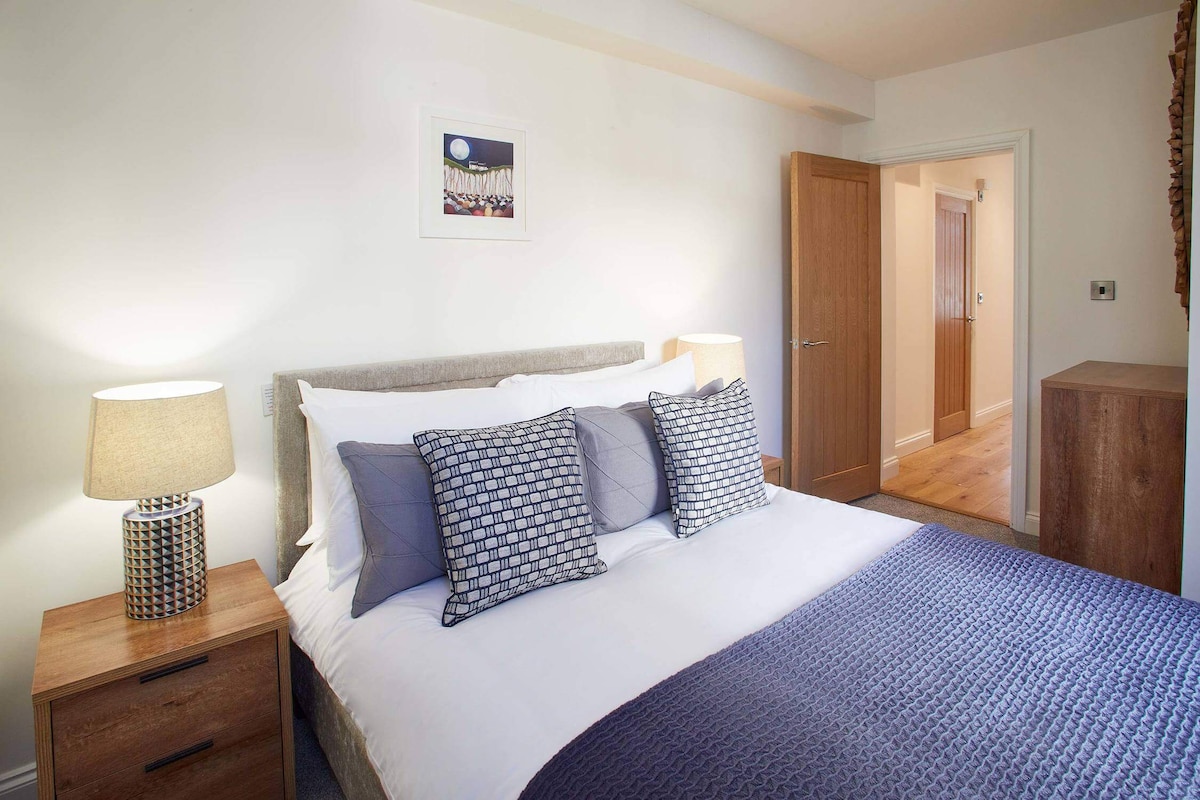 Head down the hallway from the dining area and you’ll find the first of the two bedrooms. With a zip and link bed you have the option to configure this as one kingsize bed or two small singles. The bed features an upholstered, Chelsea style headboard and is dressed with grey toned cushions and bed throw. With marble style bedside tables and matching lamps the room is simple and symmetrical.