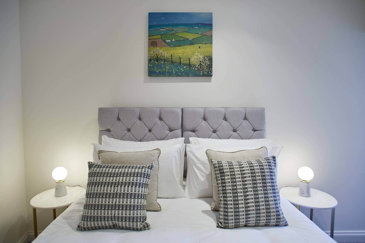 The second bedroom can be found at the end of the hallway. This room features a double bed with a mink coloured fabric headboard and dressed with blue and grey patterned cushions. The room is finished off with geometric patterned lamps and artwork by Bridget Wilkinson.