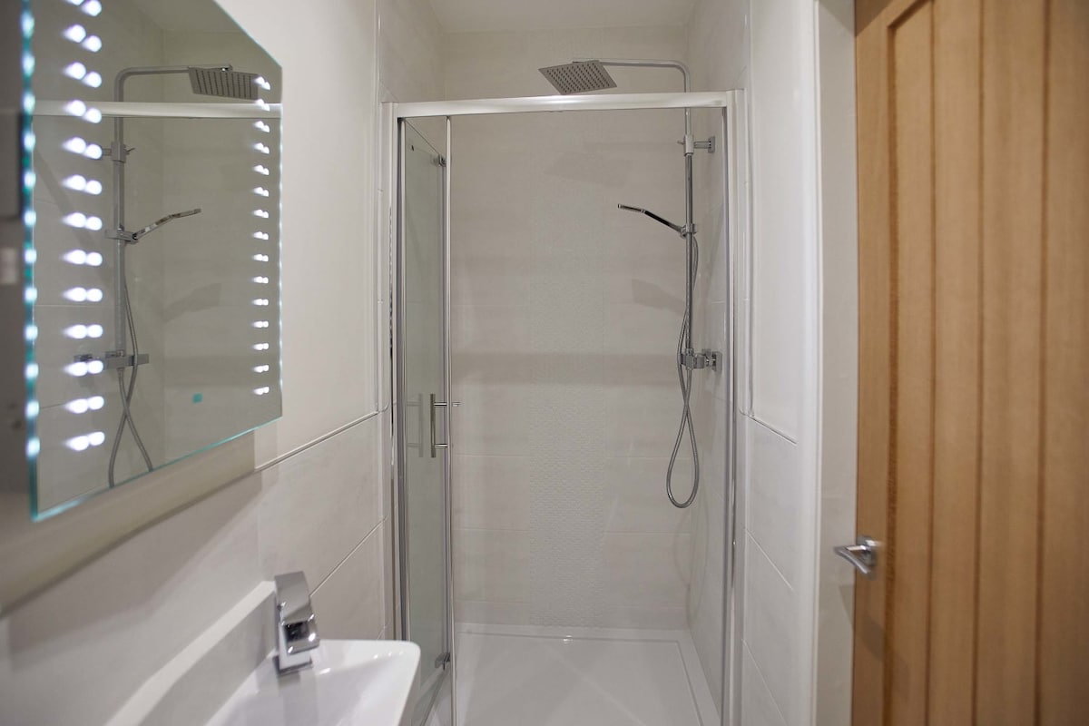 Head back to the hallway and you’ll find the bathroom. The bathroom includes a WC, basin and large walk in shower. It feels fresh and modern with chrome fixtures and fittings and large white ceramic tiles on the walls and floor.