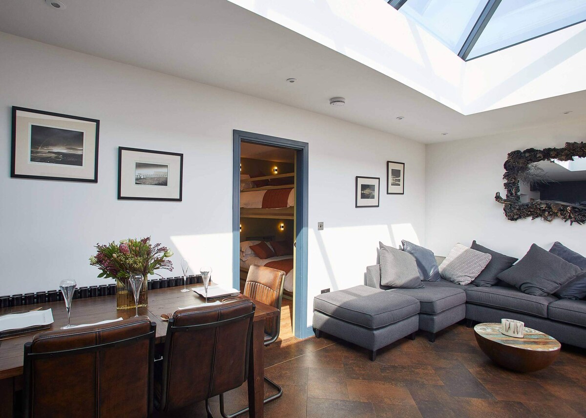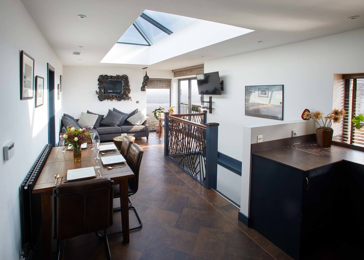 Upon entering The Nook you’ll be wowed by the impressive interiors!Head up the stairs and you’ll find yourself in the large open plan living, dining and kitchen area. Light floods in from the roof lantern, full height corner window and large Juliette balcony. Relax on the grey, corner sofa with a good book or switch on the flat screen TV to have your pick of the channels on Sky. Lose track of time as you sit at the cosy table nestled in the balcony area. Nothing beats opening the bi-fold doors and listening to the waves in the distance.