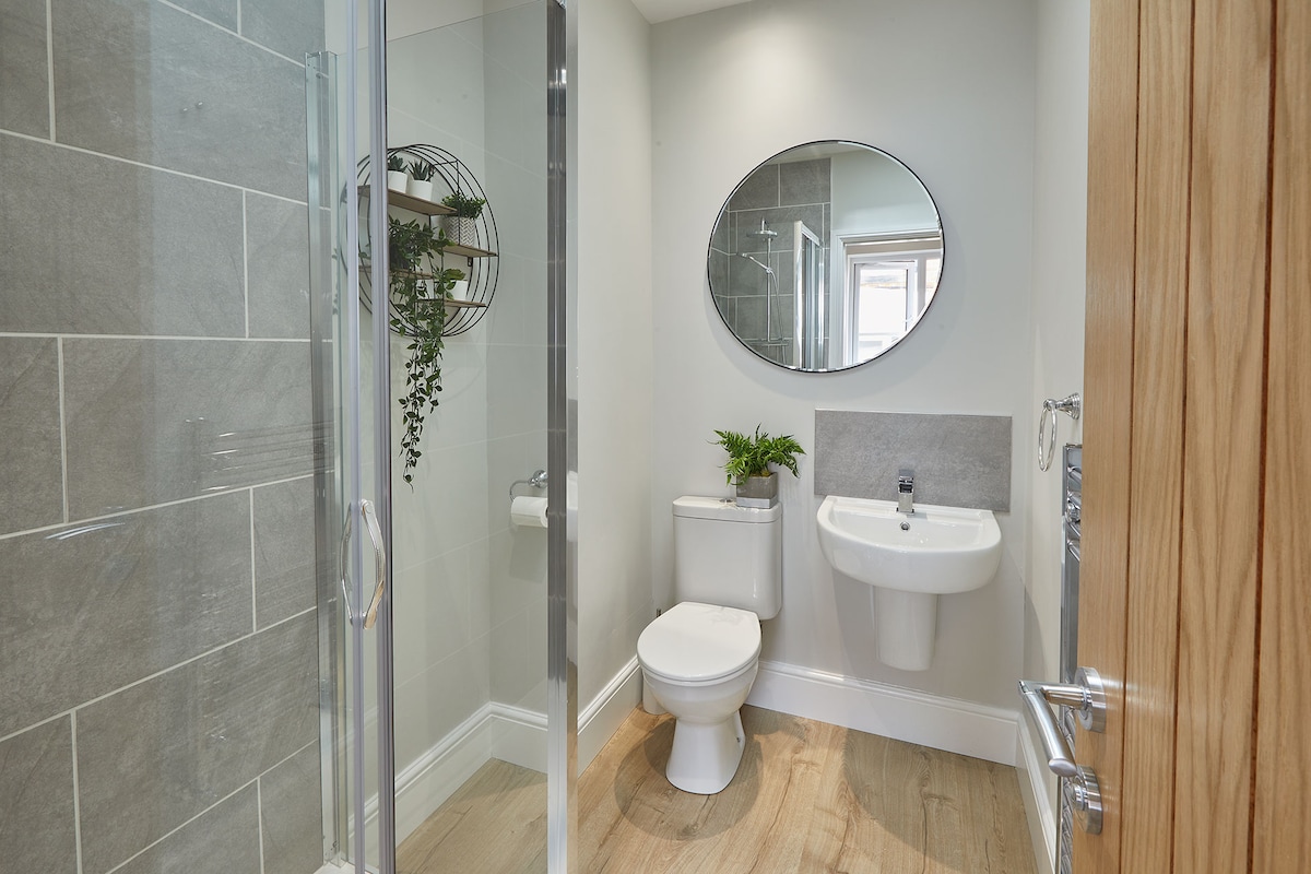 The bathroom boasts a modern look with neutral coloured walls and large grey tiles. With chrome finishing and accessories, it is sleek and stylish. The space is complete with a large walk in shower, WC and basin.