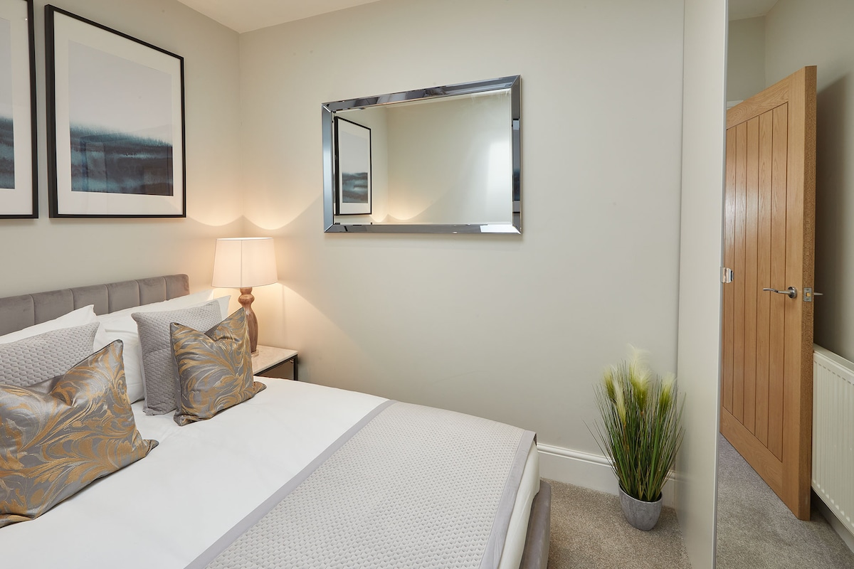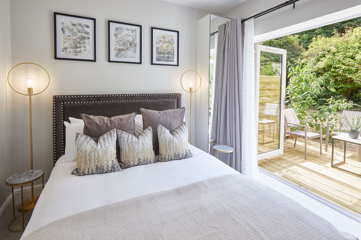 Head up the steps and you’ll arrive at the master bedroom directly in front of you. The luxury King size bed features a suede, headboard with metal stud detailing and premium linens. Decorated to the highest standard, there are matching gold floor lamps at either side of the bed to go with gold bedside tables. There is a statement sunburst style mirror on the wall and a dressing table area featuring a grey chair and large round mirror.