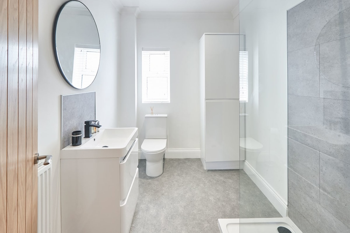 The family bathroom is more than adequate with a walk-in shower, sink and toilet all comfortably fitting into this clean and shiny space.