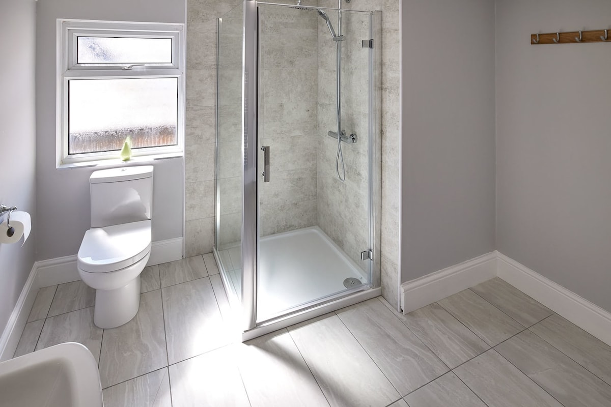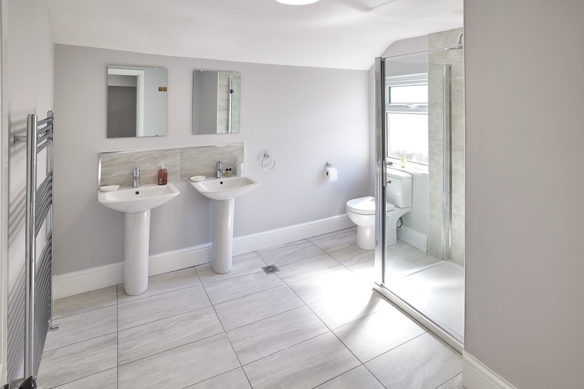 Modern and spacious, the bathroom has a walk in shower, WC and basin.