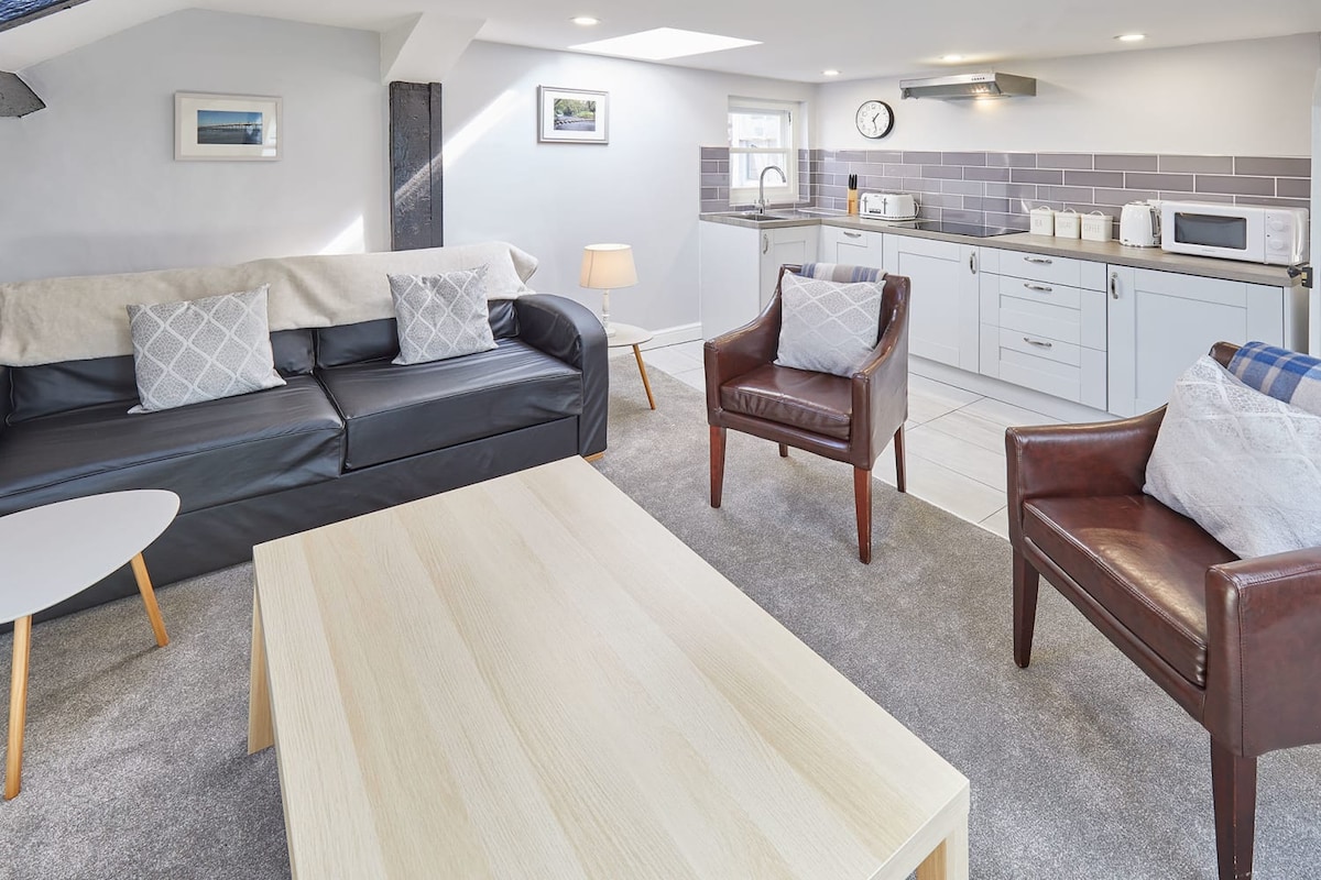 The Lealholm at Brunswick Holiday Apartments has everything you could need for a coastal getaway. Cosy and welcoming, the living area includes a leather sofa, two chairs and a flat screen TV. The kitchen is shaker in style and features modern appliances like a kettle, microwave and toaster. Please note that there is no oven at The Lealholm.The apartment has two bedrooms. The master bedroom includes a comfy double bed and the second is a twin. Both rooms boast crisp bed linens and plush bedding to ensure you have a blissful night's sleep.