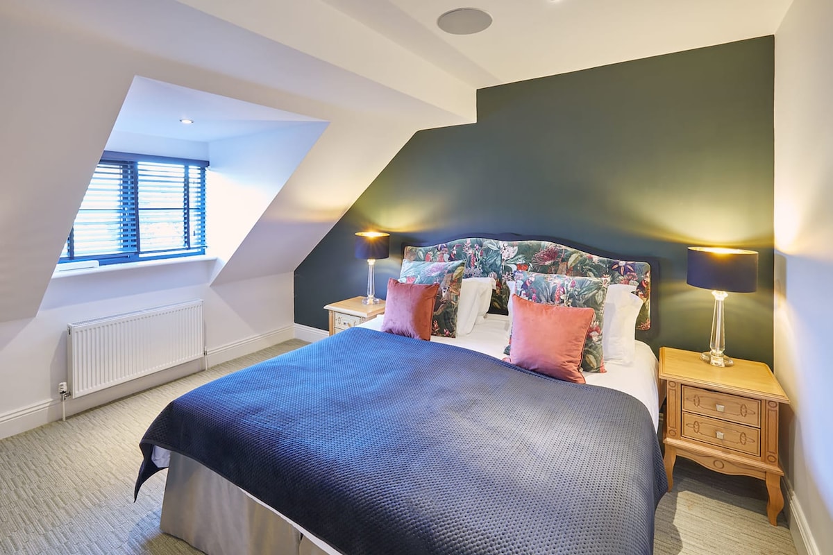 The master bedroom features a truly stunning feature wall with wild flower detail. The super king bed is finished with bold orange fabric headboard and crisp white linens. This room benefits from an ensuite shower room.