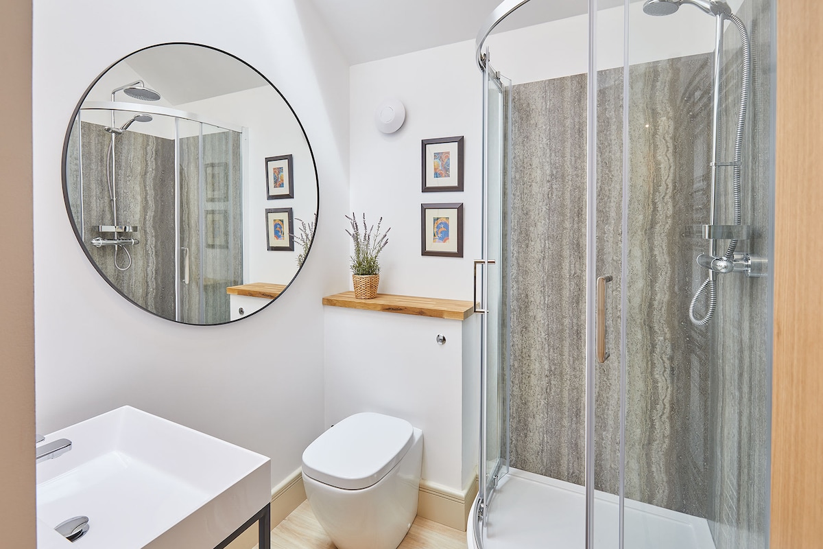 The bathroom is situated between the kitchen and second bedroom and features a large corner shower, WC and wash basin.