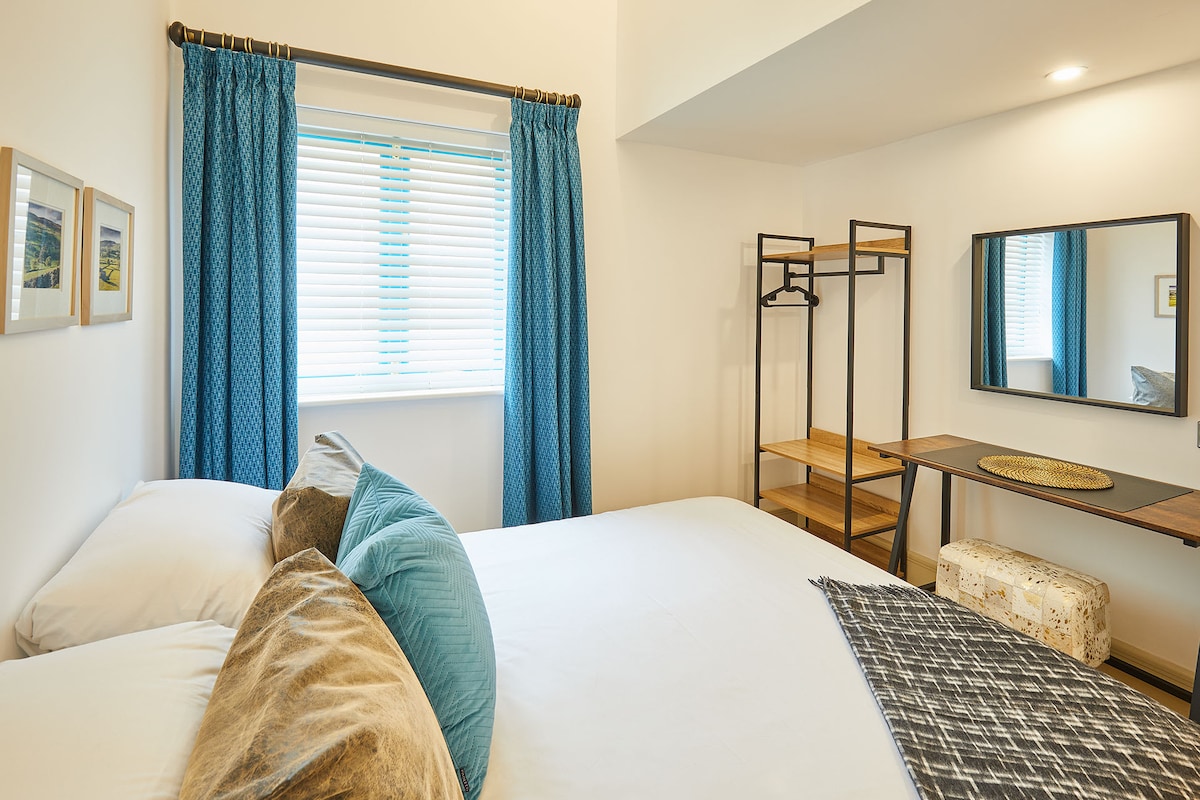 The two bedrooms are located just off this main room. The first bedroom is a twin room with two single beds and the second room features a comfortable double. Both rooms have a cool colour palette, storage for your personal items and the beds are dressed with luxury linens to aid a peaceful night sleep.