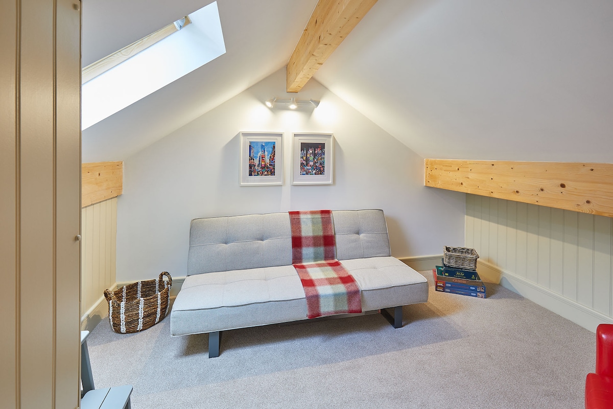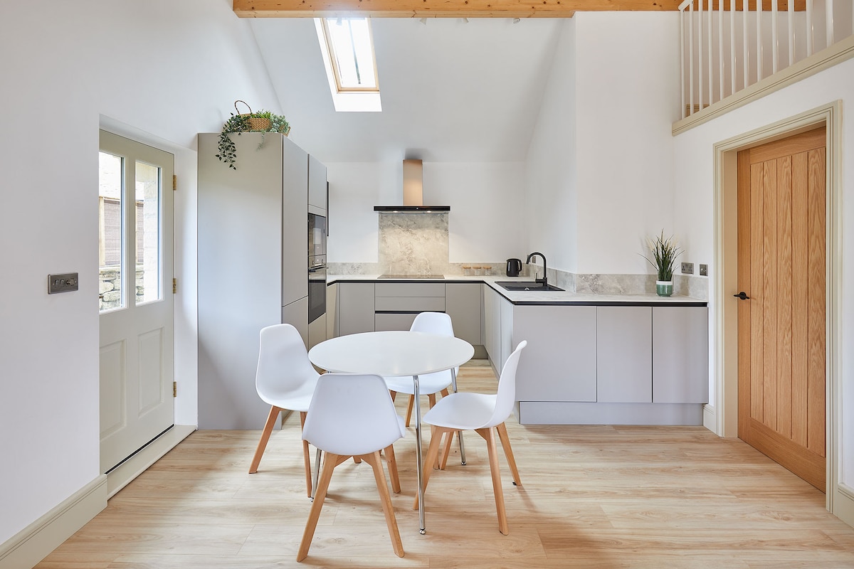 The living room is home to a pale two seater sofa, a sheepskin style foot stool, a bright yellow feature chair and single occasional chair, perfectly placed in the window. With a large flat screen TV you can enjoy evenings at home watching your favourite box set. Fitted with streaming apps, you can log into your account and pick up where you left off. The dining space sits alongside the living room with a round dining table and matching chairs for four.
