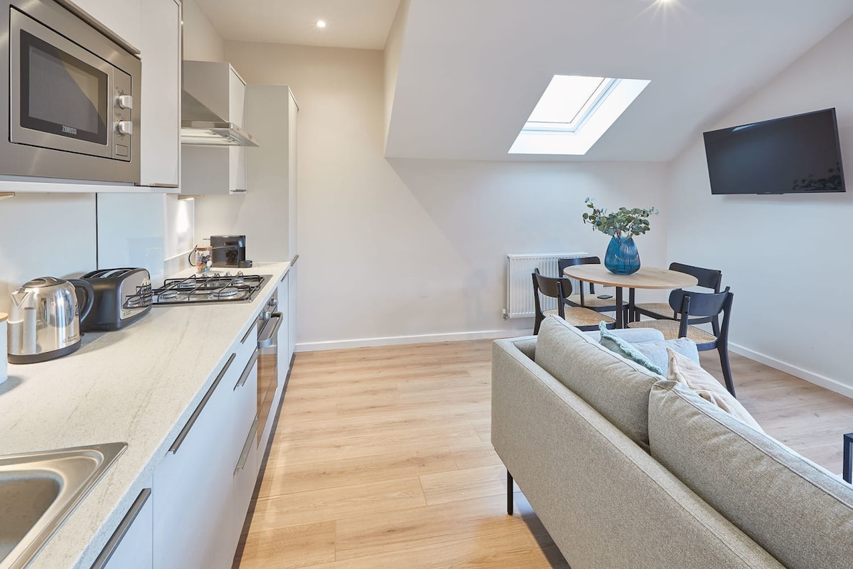 Skyline Apartment benefits from an open plan social space with the kitchen, living and dining area together. With a skylight window and patio doors which open out onto the balcony, there is plenty of natural light flooding the room to create a truly relaxing feel. The space is complete with a flat screen TV, fully equipped kitchen, dining area with stylish rattan chairs and light blue sofa.Sleeping up to 4 guests, the apartment has two spacious bedrooms. Both rooms feature comfy double beds with premium bed linens and plush bedding.