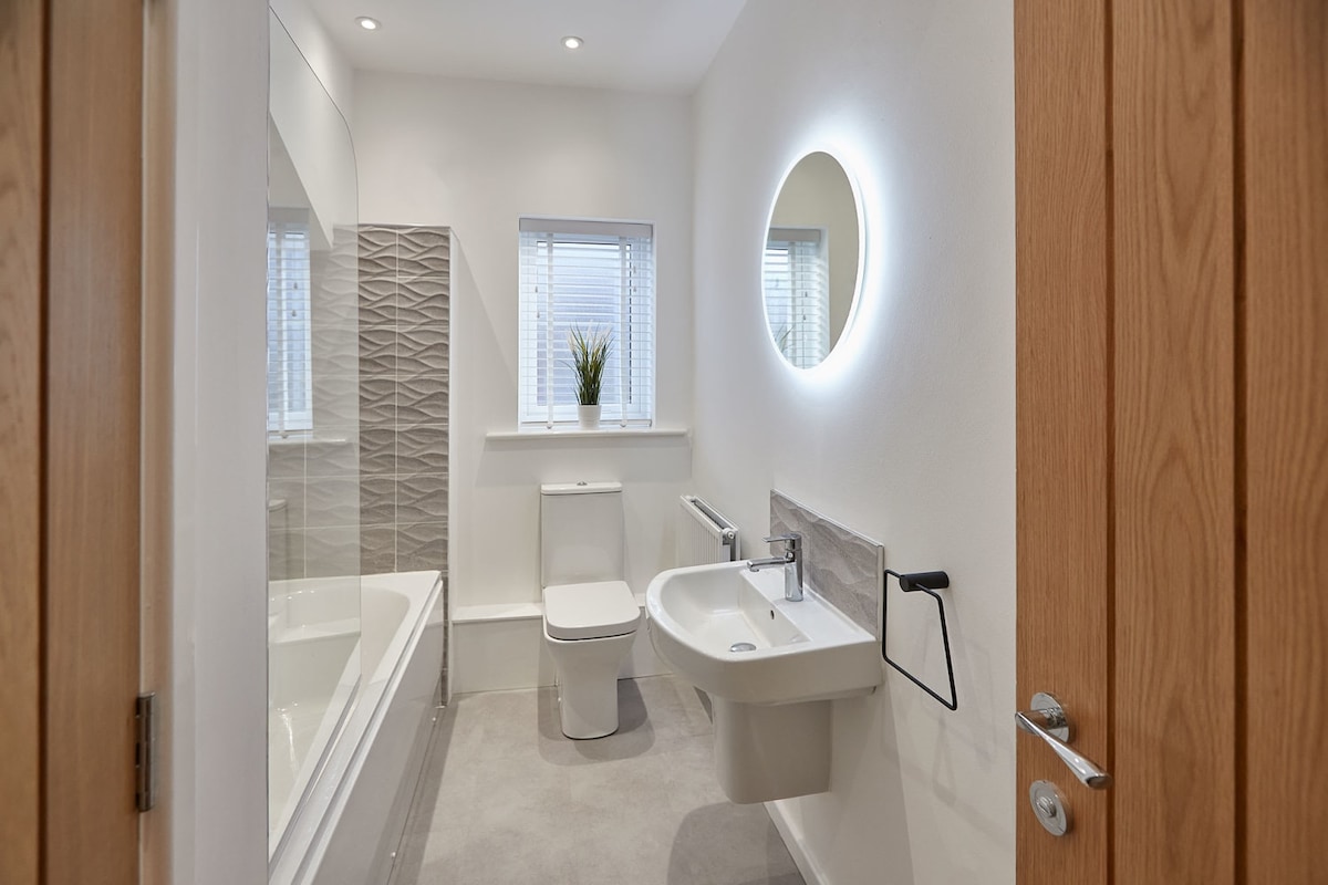 The bathroom is ultra-modern with large tiles and an illuminated mirror. The room is complete with a bath and overhead shower, WC and basin.