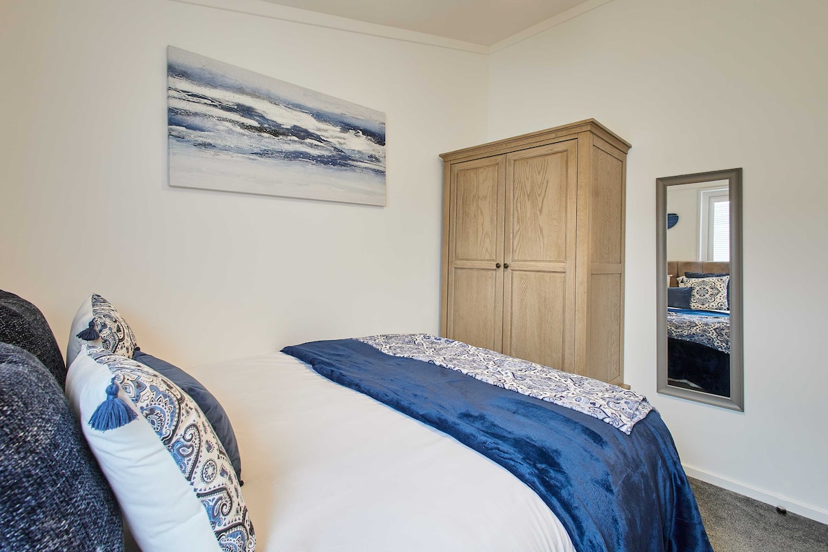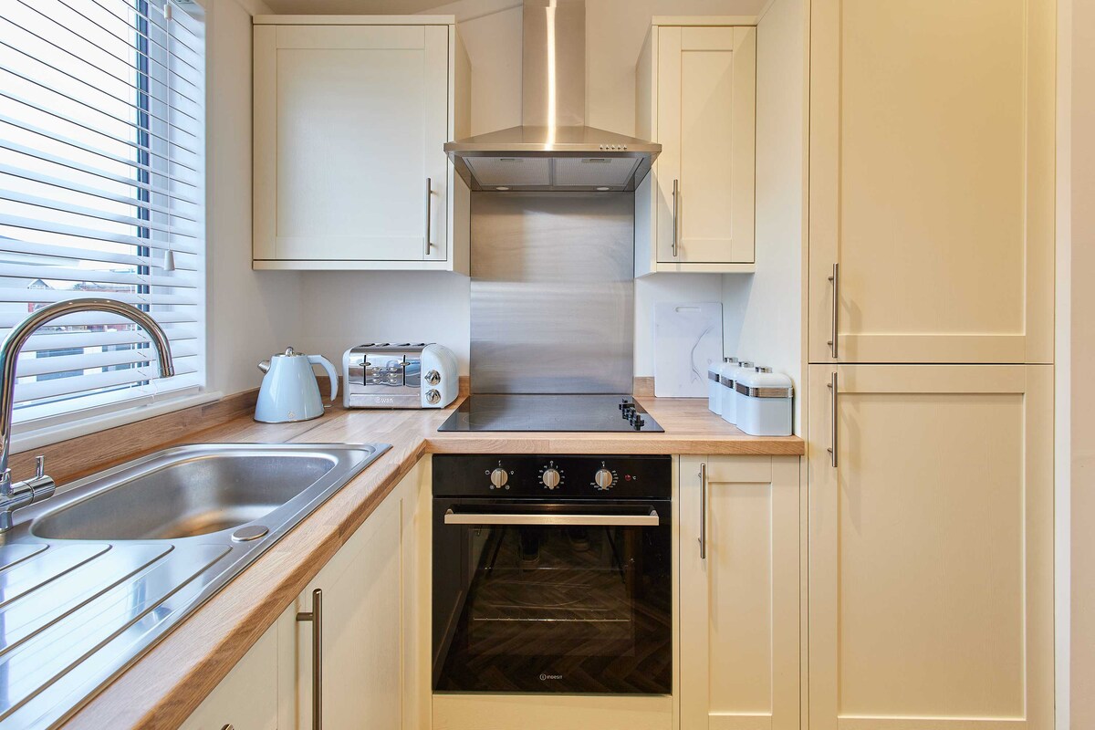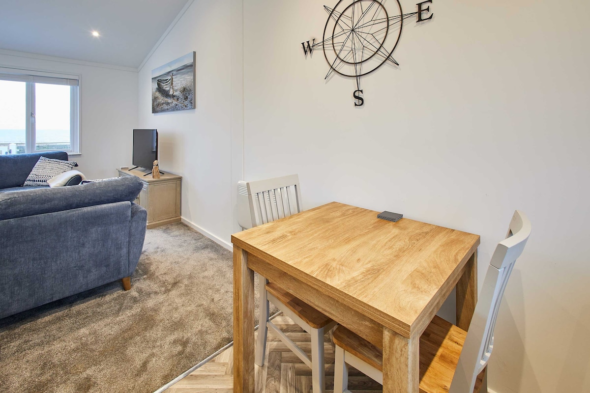 Sea View Road has a cosy and homely living room where you can unwind with your loved ones. There are two charcoal-coloured sofas and a TV with Freeview so it’s a great place to relax.The lodge has a fully equipped kitchen with appliances aplenty including an oven, hob, toaster, kettle, microwave, fridge. freezer and washing machine. Modern in style, the kitchen cabinets are white with smooth wooden worktops to create a stylish space.