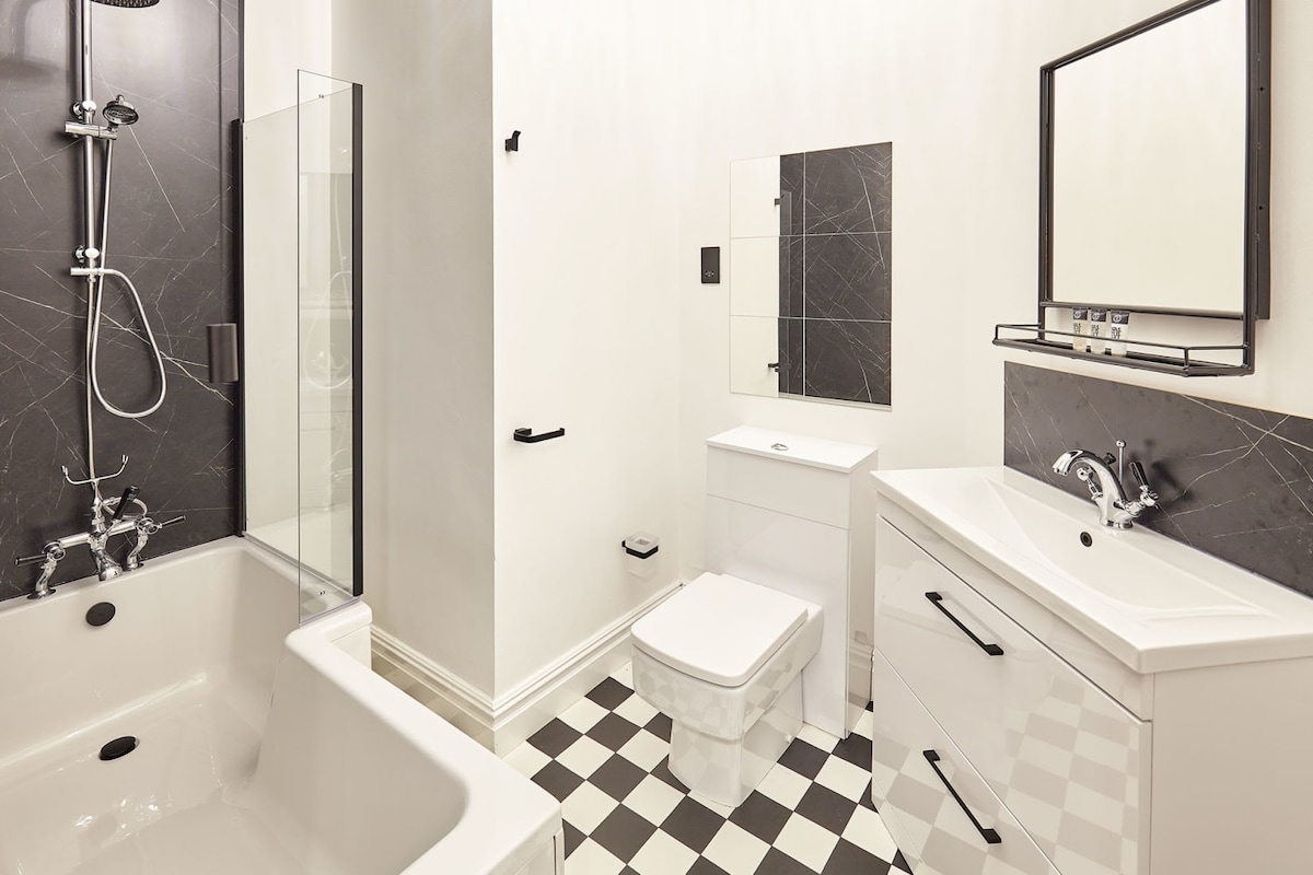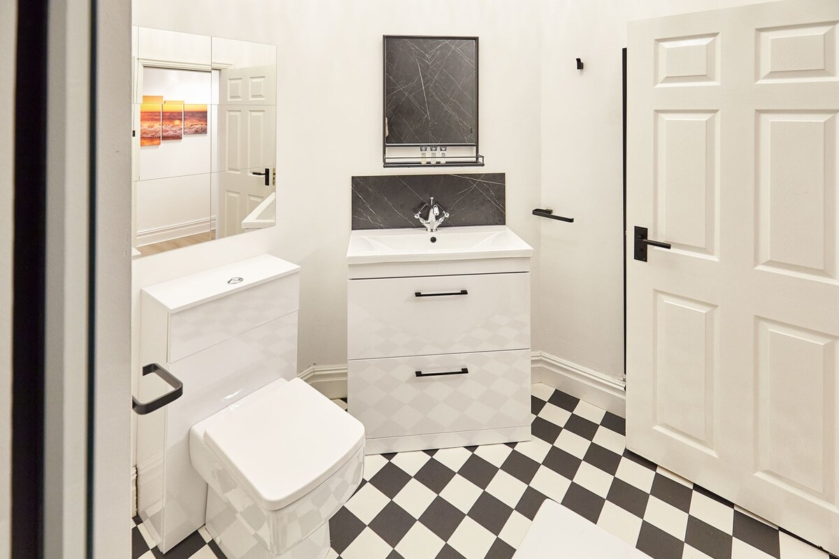 A beautiful classy apartment looking out onto the seaside. Great view of the coastline from the living room and bedroom windows, and also from the dining room window. Warm and comfortable, with all the necessary amenities. Classy apartment done out in black and white, with leather dining chairs and glass topped table. Comfortable brown sofas in the lounge with a large 65” TV, WiFi, and Virgin TV.