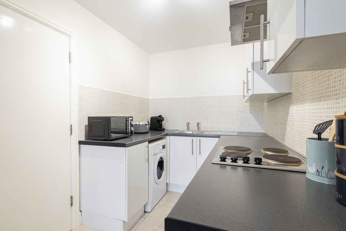 This contemporary dog friendly apartment is a peaceful retreat by the sea.Upon entering the apartment, you’ll find the open plan living, dining and kitchen space. The kitchen is a bright white colour with smooth black worktops. Equipped with modern appliances and all cookware, you’ll be able to prepare meals easily during your visit. The dining area includes a wooden table and four dining chairs to ensure all guests are catered for.