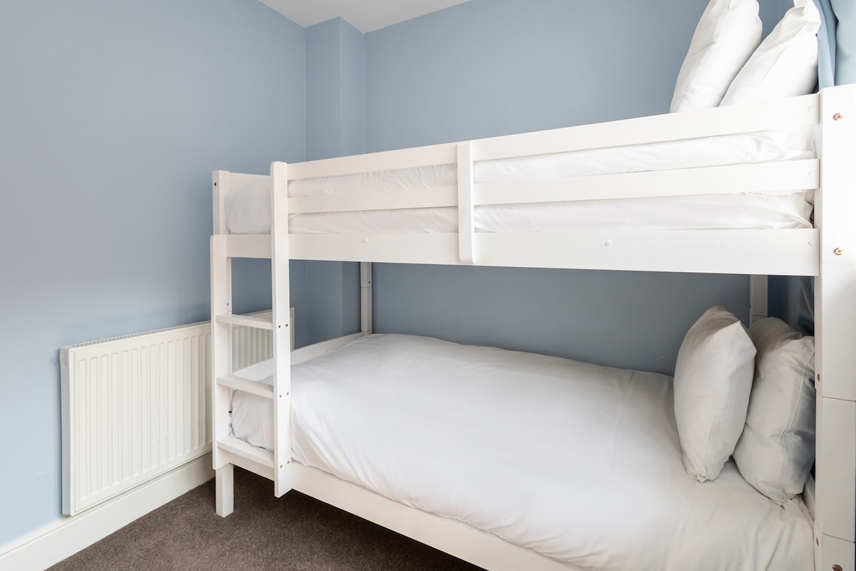 You’ll find two bedrooms at Sandy Bay. The master bedroom features a comfy double bed, premium bed linens and a tranquil blue colour scheme. Ideal for younger ones, the second bedroom is home to a bunk with two single beds.
