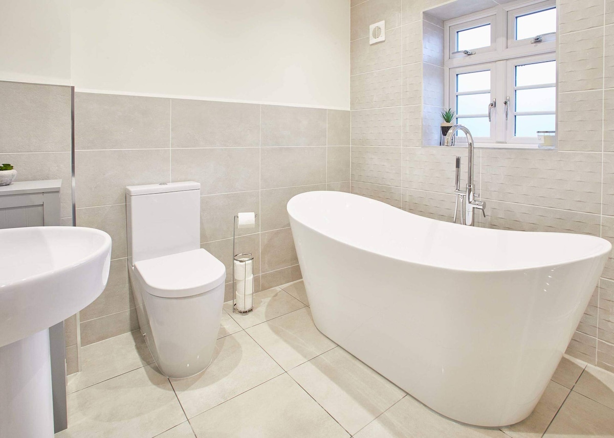 The main bathroom has a seriously stylish feel. It features a striking free-standing bath and luxurious textured tiles.