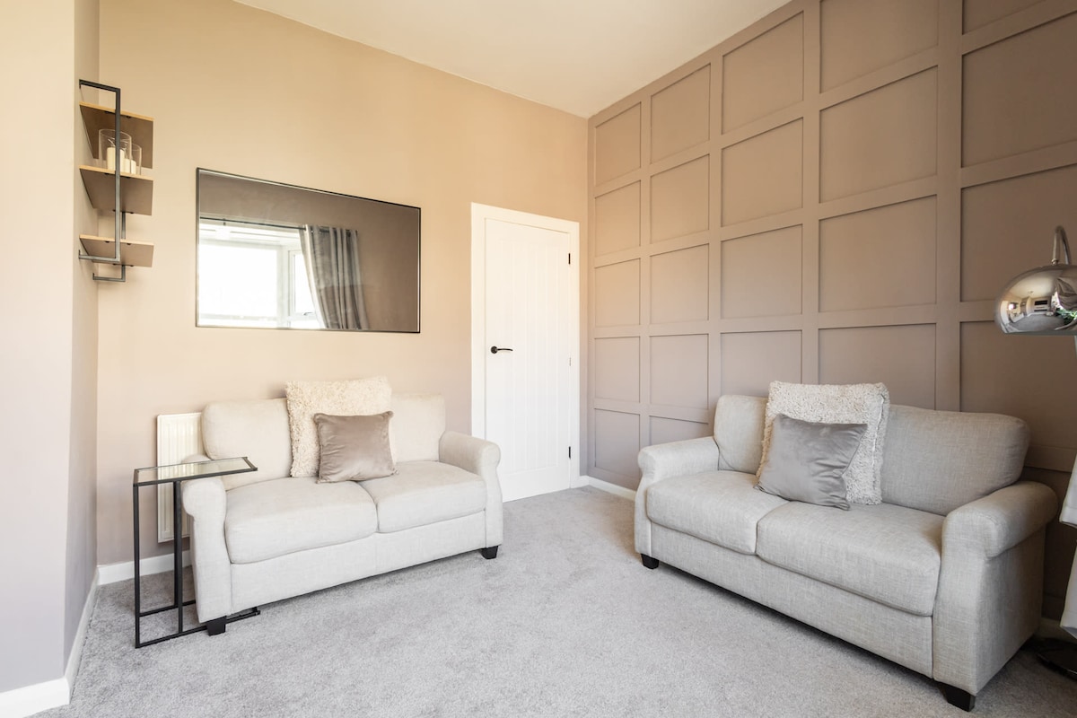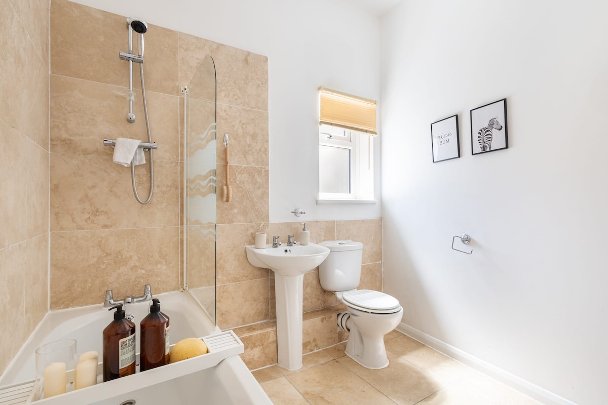 High Street has a bright and spacious living room area which can be found as you enter the apartment on the right at the top of the first set of stairs. Featuring a modern media wall with flat screen Smart TV and two comfy sofas, this space is perfect for relaxing.The family bathroom, also located on the first floor, features a bath with an overhead shower, WC and basin.