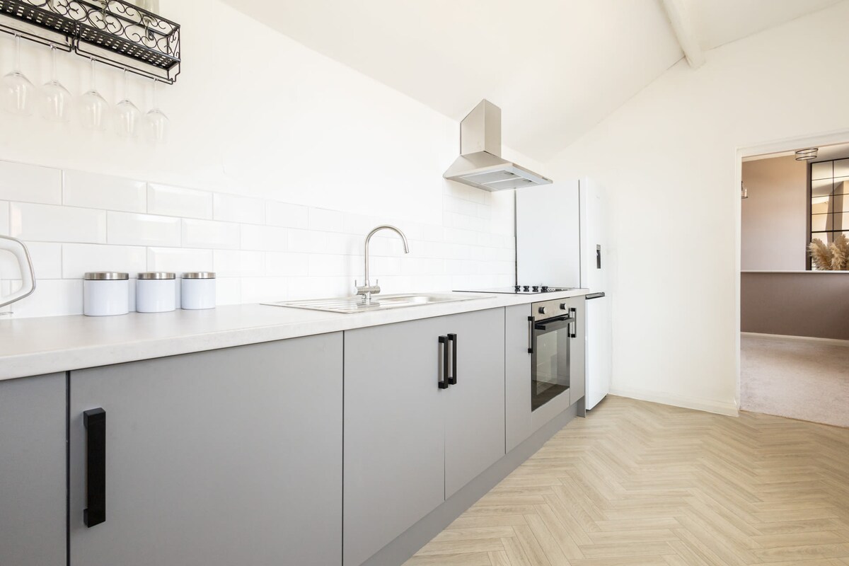 The kitchen can be found at the end of the first-floor hallway. Sleek in style, the kitchen boasts dove grey, smooth cabinets and modern appliances. With everything you could need to prepare meals during your stay, you can make the most of your self-catering stay in Loftus.