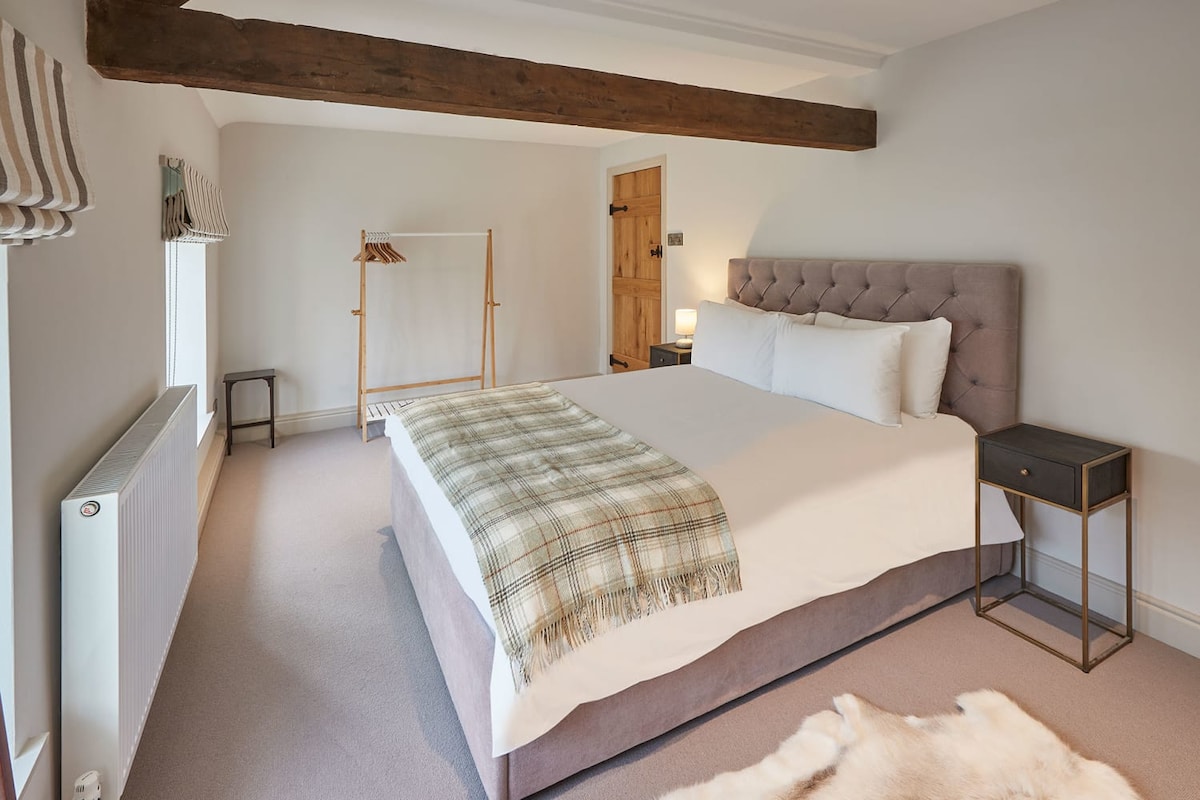 The Cobbles has a bright and welcoming open plan living, kitchen and dining area. With exposed beams and tiled floors, there is a traditional, cosy cottage feel so you’ll instantly feel at home. When it’s cold outside, fire up the log burner and retreat to the sofas in the living room with your loved ones.The property boasts a beautiful shaker style kitchen in dove grey. Fully equipped for self-catering stays, you’ll have everything you could need to prepare meals. Enjoy your home cooked meals at the dining area which includes a traditional wooden dining table with a bench and five dining chairs.