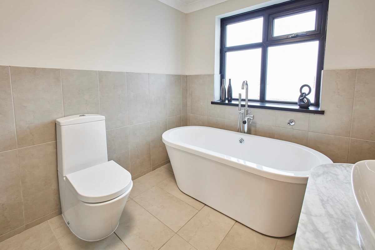 Roseberry Topping Townhouse is a truly special stay in the village of Great Ayton. Offering an open plan living, kitchen and dining room, three bedrooms, a family bathroom, and a private patio area, you’ll be treated to a truly spectacular holiday home with plenty of perks.On the first floor, you’ll find the first bedroom, open plan kitchen, living and dining area plus the family bathroom. Modern and spacious, the bathroom benefits from a freestanding bathtub with handheld shower, as well as a WC and basin.