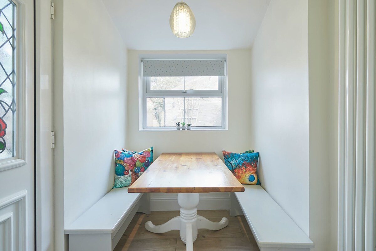 With beamed ceilings and a sash window, Rose Cottage benefits from traditional features in the living room to create a cosy and homely feel. With two leather sofas, a flat screen TV and a log burner, this is the perfect spot to retreat to with your loved ones after a day of exploring Pickering.Fully equipped for self-catering stays, the kitchen includes modern amenities and cookware so you can prepare delicious home cooked meals during your stay. The dining area at Rose Cottage is a cosy space with a large wooden dining table and two benches.