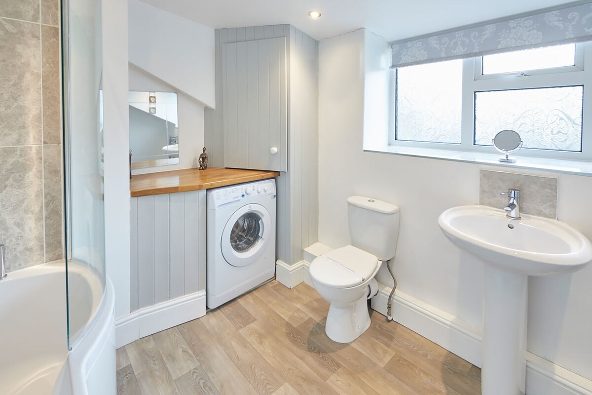 Modern and clean, the family bathroom features a bathtub with an overhead shower, WC and basin. There is also a washing machine in this room.