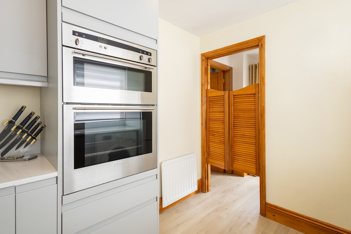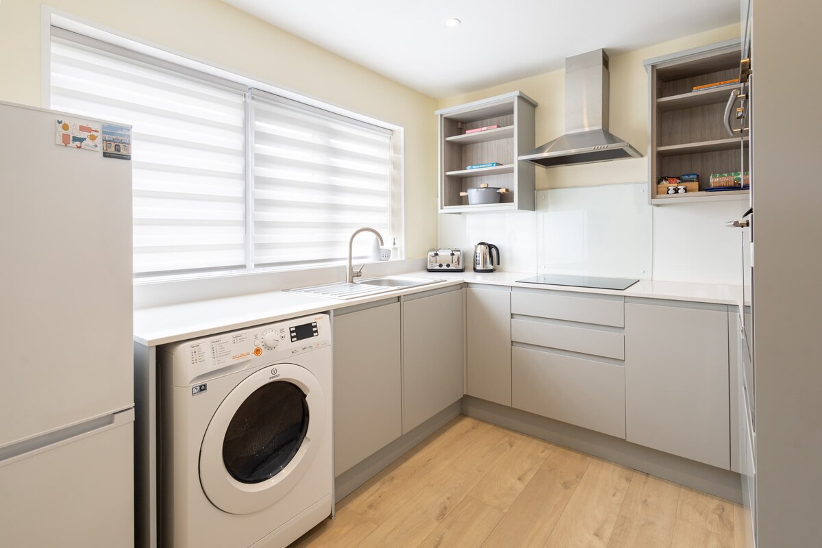 Ultra stylish, the kitchen has light grey cabinets and white splash back. Silver hardware adds to the modern look. Fully equipped, the kitchen has everything you could need to prepare meals easily with modern appliances and cookware.