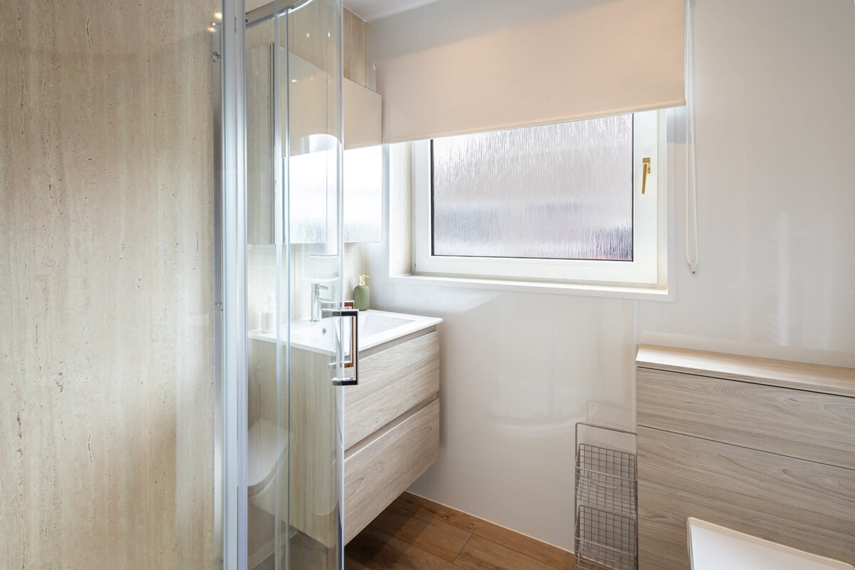Featuring a combination of beige and white, high shine walls, and silver hardware, the family bathroom at Riverbank is sophisticated and modern. A walk-in shower, WC and vanity unit complete the space.